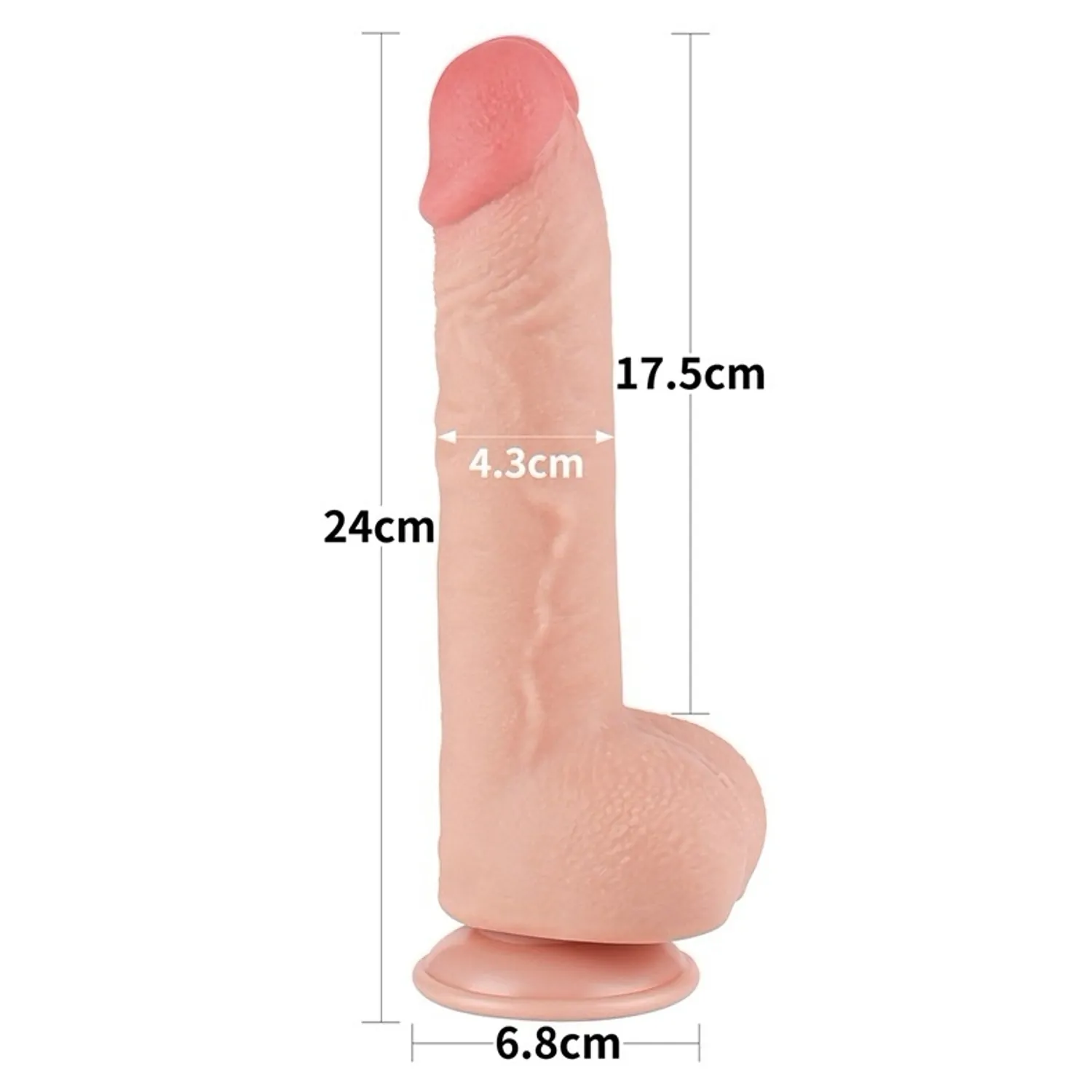 Dong realist LoveToy din TPE sliding-skin cu tehnologie dual density: exterior moale, nucleu ferm. Lungime perfectă 24 cm, calibru ≈4.3 cm, ventuză detașabilă cu prindere puternică. Flexibil, lipsit de vibrații. Recomandat material lubrifiere pe bază de apă și spălare cu săpun neutru.