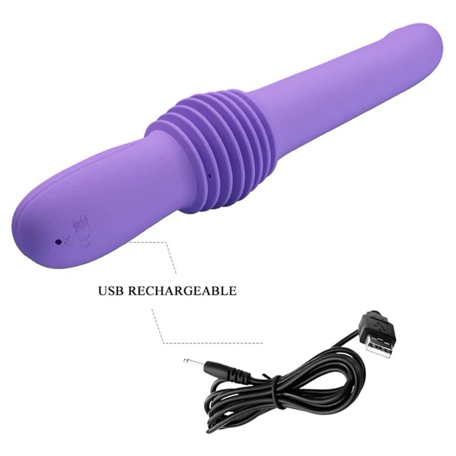 Vibrator Pretty Love Pazuzu Purple: pistonare până la 7 cm, 3 moduri, silicon catifelat violet, ansamblu de prindere ergonomic și încărcare USB. Discret, robust la apă și ușor de curățat.