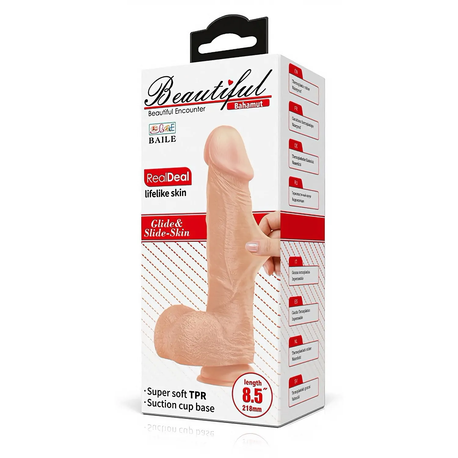 Realist și stabil: Baile Bahamut, 24 cm total, 18 cm inserabili și diametru 5 cm. Textură detaliată pentru senzație naturală și ventuză puternică pentru fixare pe suprafețe netede. Corespunzător pentru utilizatori care caută control și varietate de poziții.