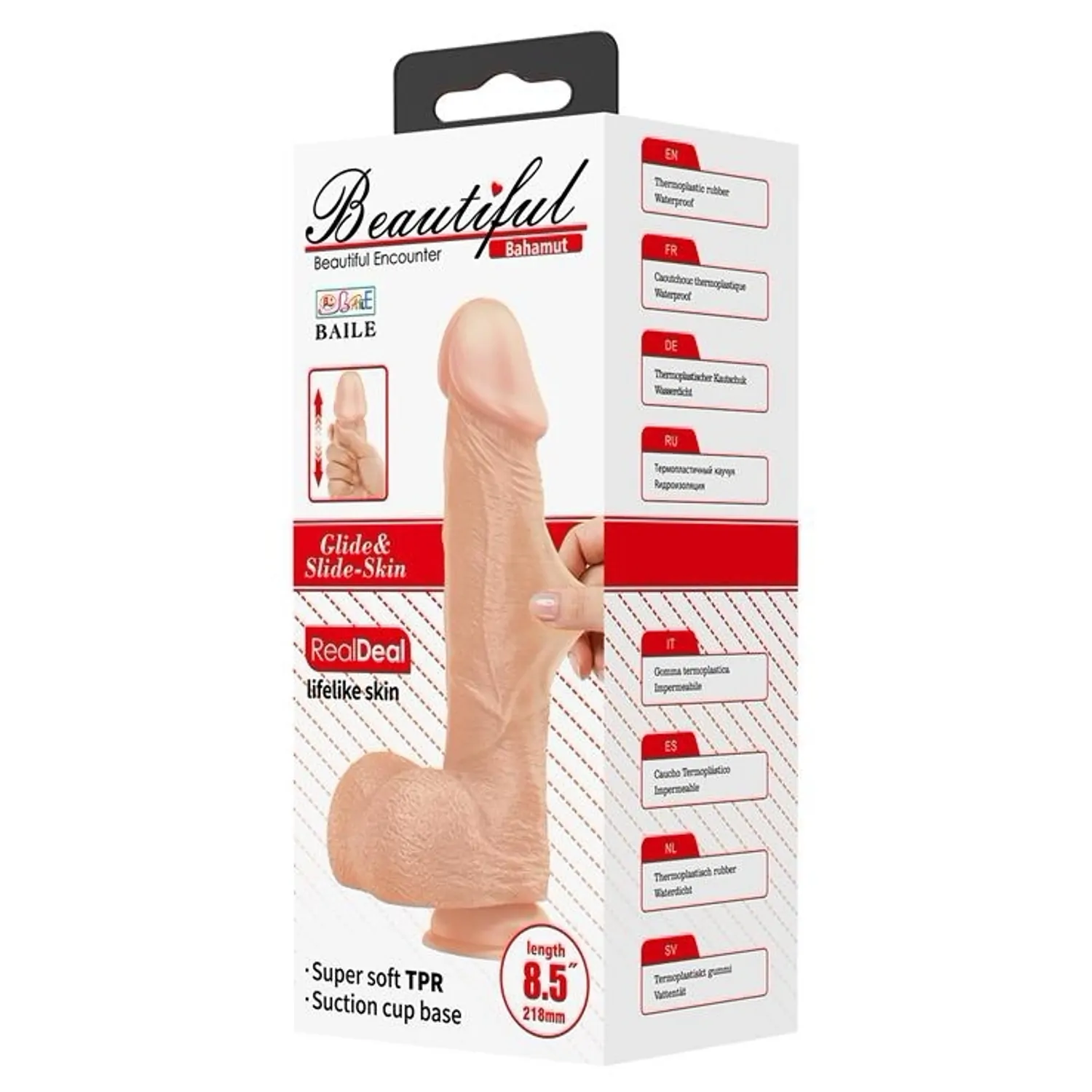 Realist și stabil: Baile Bahamut, 24 cm total, 18 cm inserabili și diametru 5 cm. Textură detaliată pentru senzație normală și ventuză puternică pentru stabilire pe suprafețe netede. Potrivit pentru utilizatori care caută control și varietate de poziții.