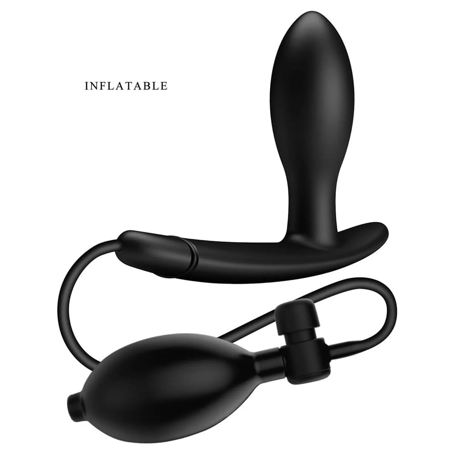 Plug anal gonflabil Pretty Love Drake — silicon negru, pompă manuală cu supapă pentru umflare controlată, bază stabilizatoare și distribuție uniformă a aerului. Recomandat cu lubrifiant pe bază de apă. Lungime 7,8 cm, calibru 2,6 cm.