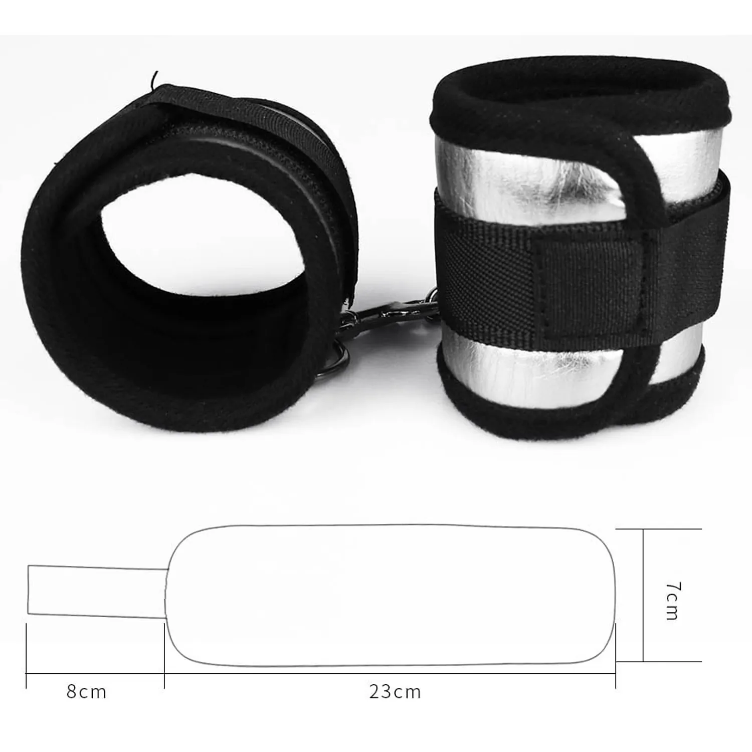 Sistemul de fixare conține centuri Velcro rezistente și cleme cu eliberare rapidă, care permit conectarea între manșete sau la alte podoabe cu inele D. Designul ergonomic menține poziția minus a presa excesiv, fiind adecvat pentru utilizatori neexperimentați sau pentru cei care vor sesiuni controlate.