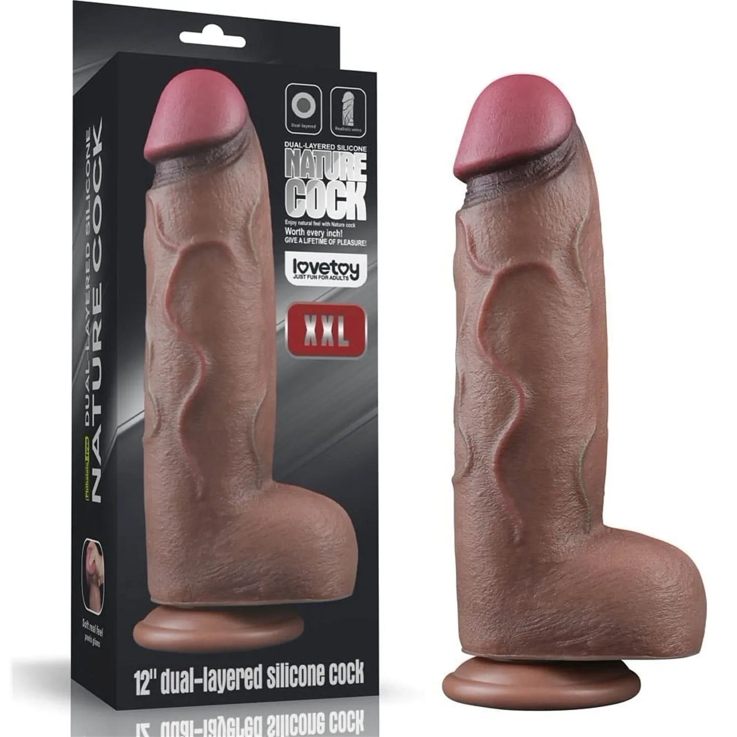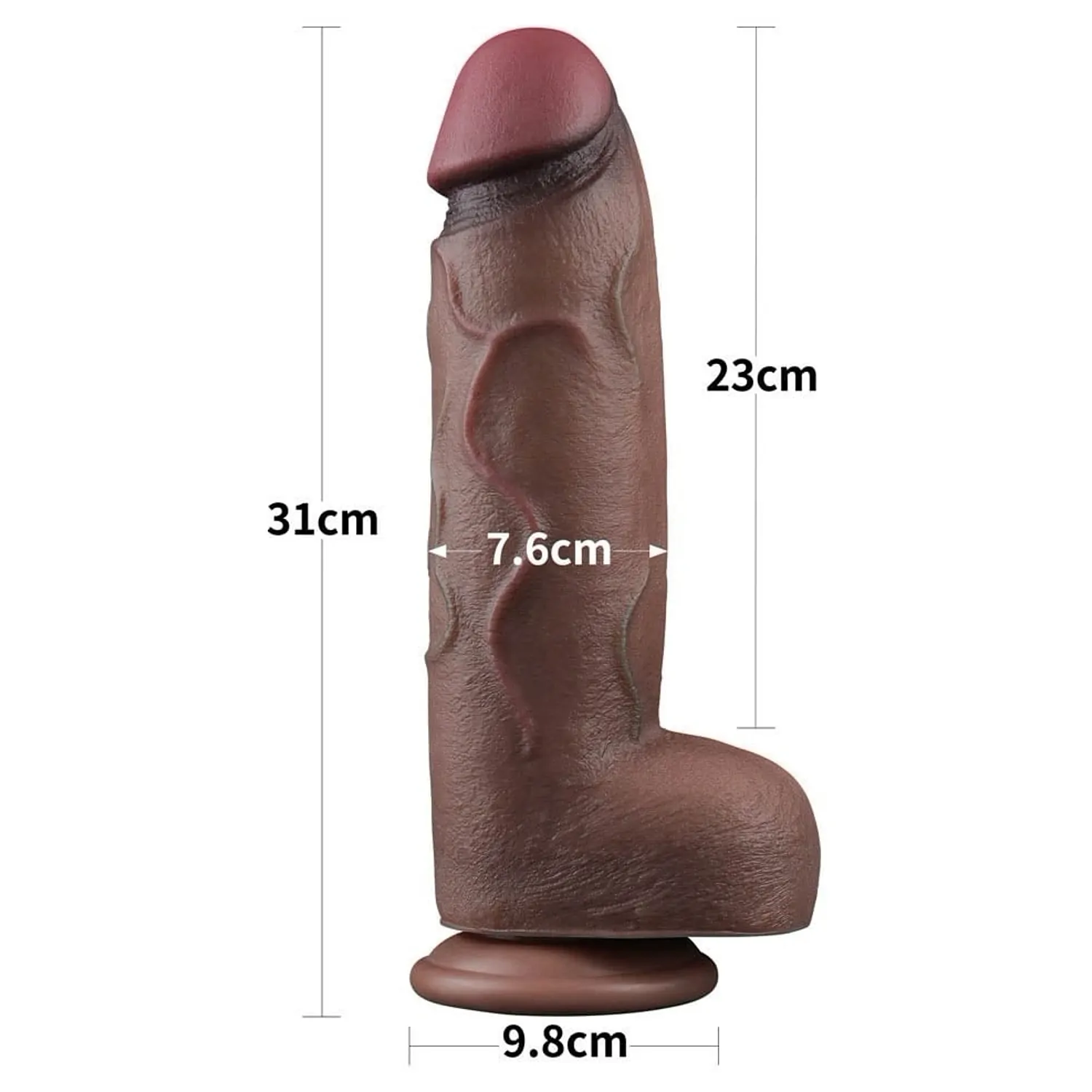 Realist Lovetoy din silicon cu două straturi — 31 cm integral (23 cm inserabili), diametru 7.6 cm. Cap rotunjit, textură discretă și bază cu ventuză pentru stabilire hands-free. Colorație maro. Ușor de curățat.