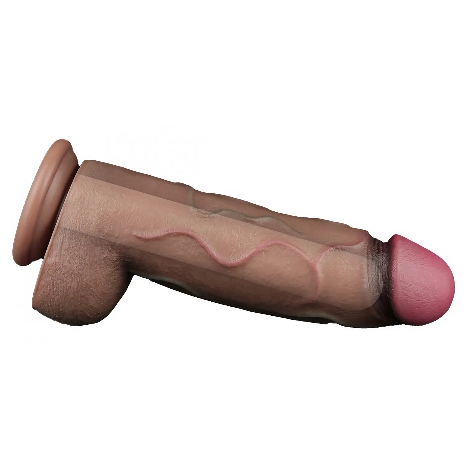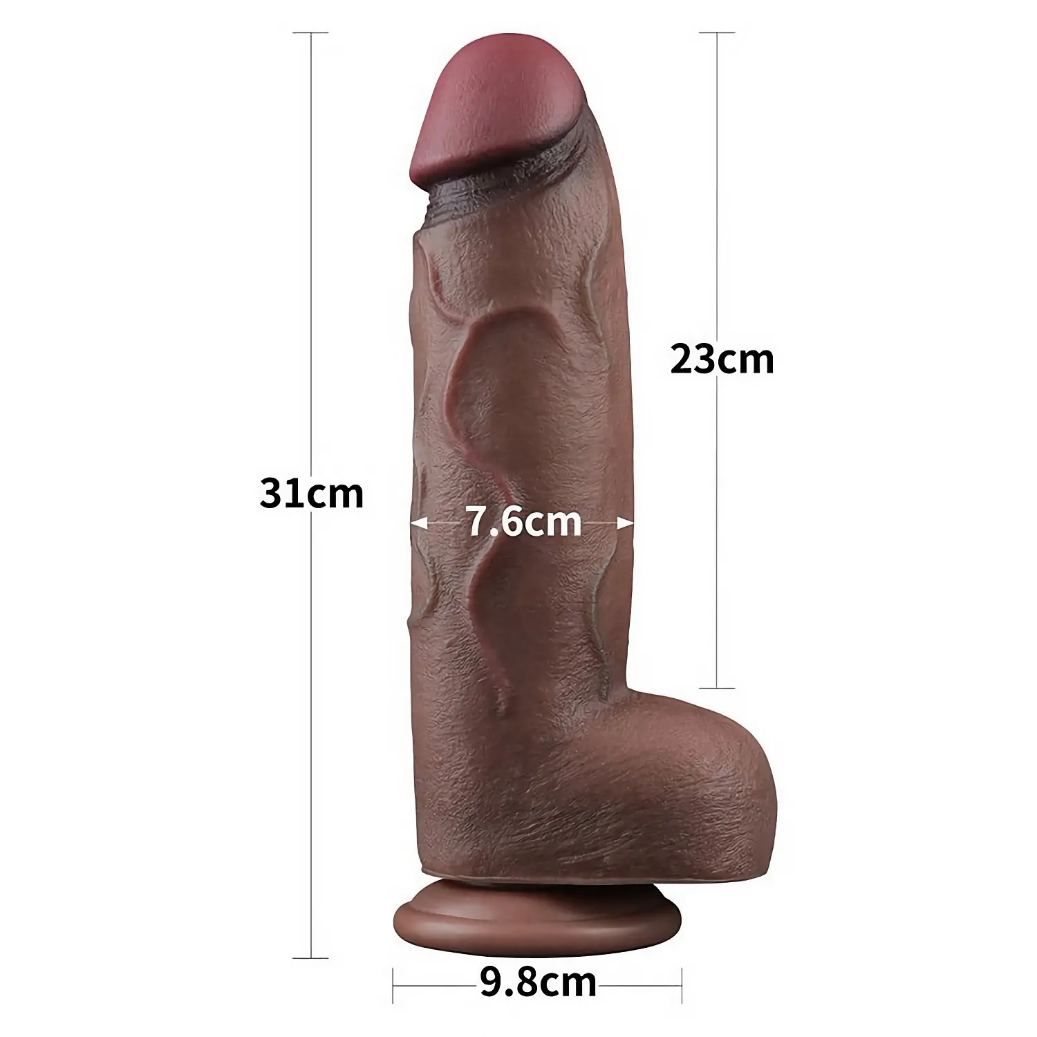 Realist Lovetoy din silicon cu două straturi — 31 cm absolut (23 cm inserabili), diametru 7.6 cm. Cap rotunjit, textură discretă și bază cu ventuză pentru stabilizare hands-free. Culoare maro. Ușor de curățat.