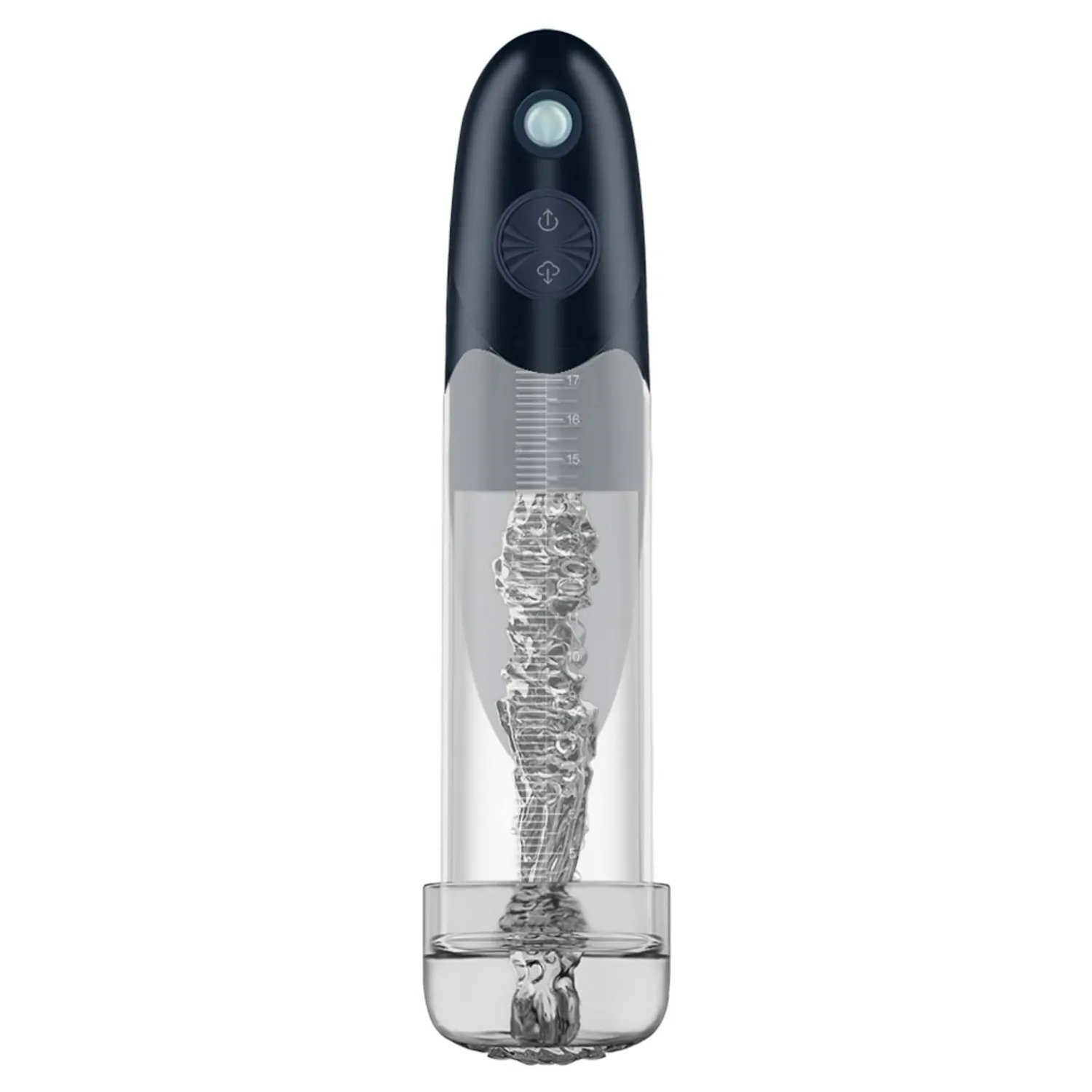 Pompă electronică Realov BathFun, proiectată pentru utilizare cu apă sau în regim uscat. Folosește presiunea uniformă a apei pentru un vid mai constant, dar funcționează la fel de bine și lipsit de apă. Cilindrul transparent conține riglă în centimetri și inch pentru monitorizare precisă.