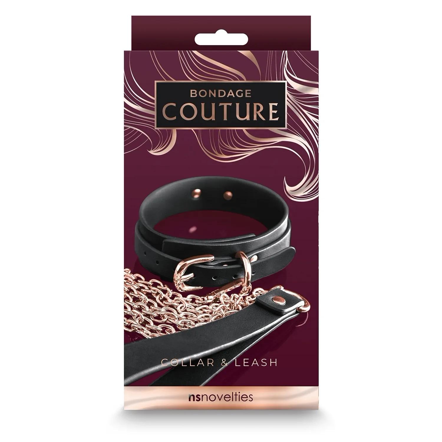 Set zgardă și lesă Bondage Couture de la NS Novelties, reglabil, din imitație de piele și metal fără nichel. Design elegant auriu-negru, lesă întinsă pentru control discret. Potrivit pentru începători și colecții fetish.