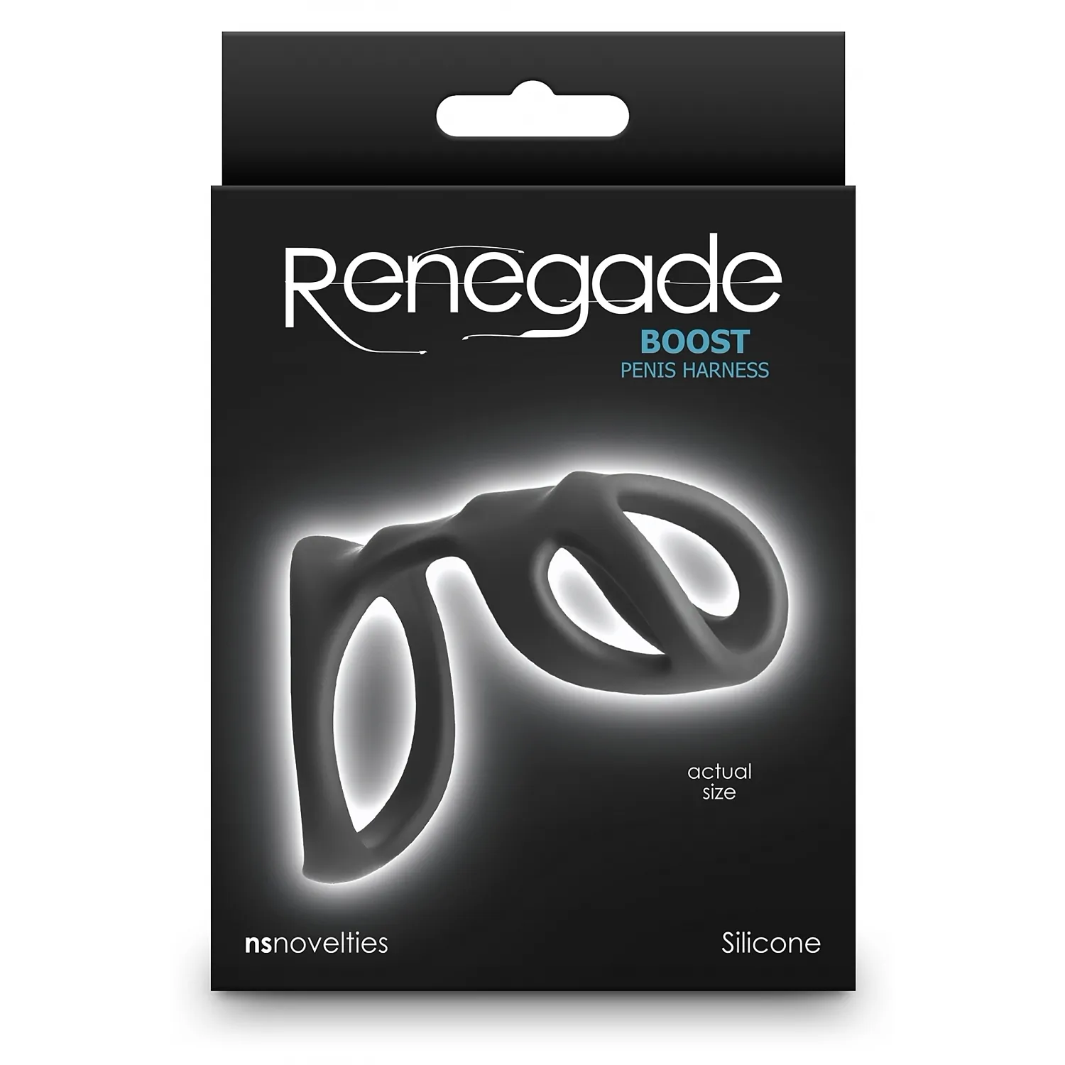 Inel penis Renegade Boost Negru din silicon medical, confortabil şi corespunzător cu lubrifianţi pe bază de apă. Dimensiuni: 10,9×5,1 cm. Se fixează la baza penisului; curăţare uşoară. Nu utiliza mai mult de 30 minute.