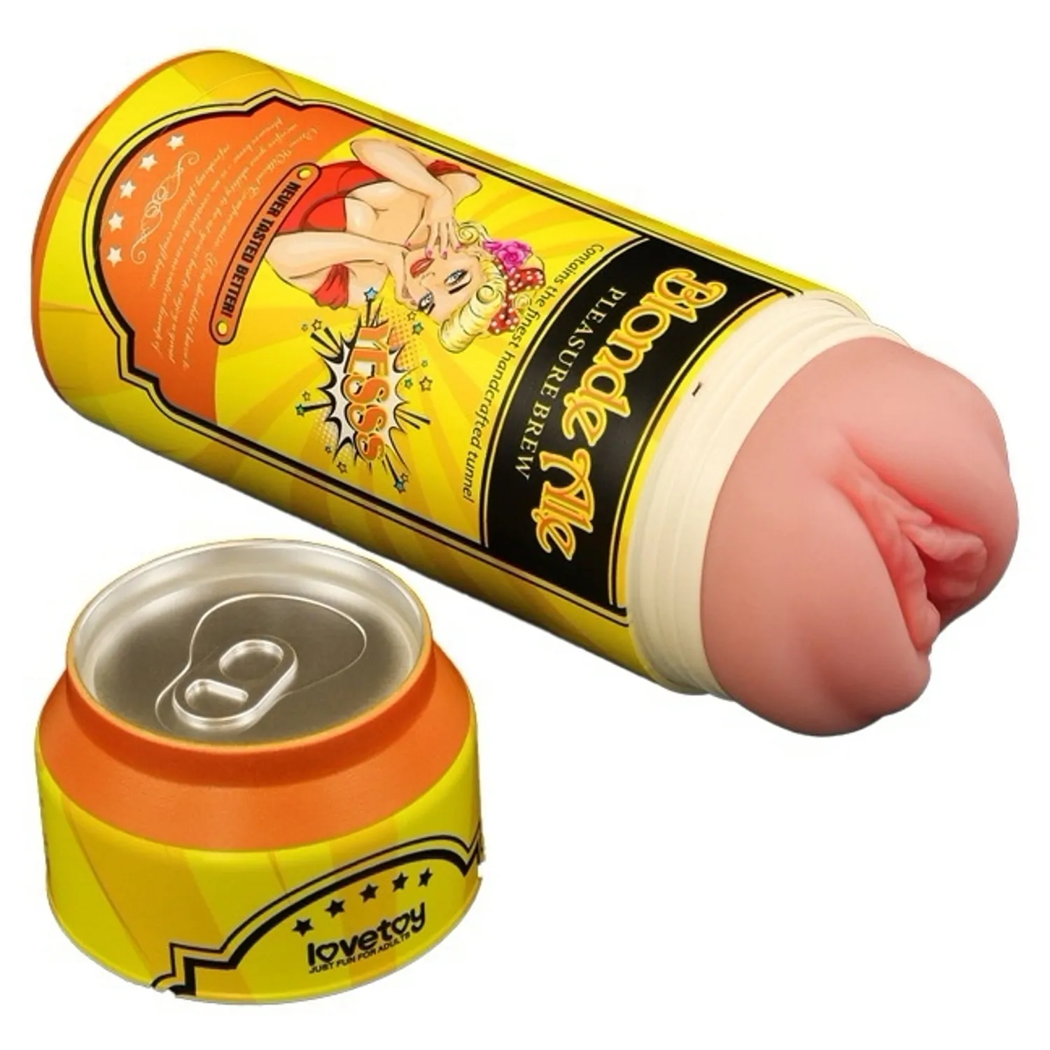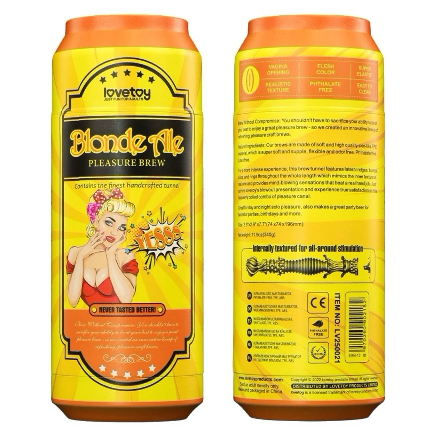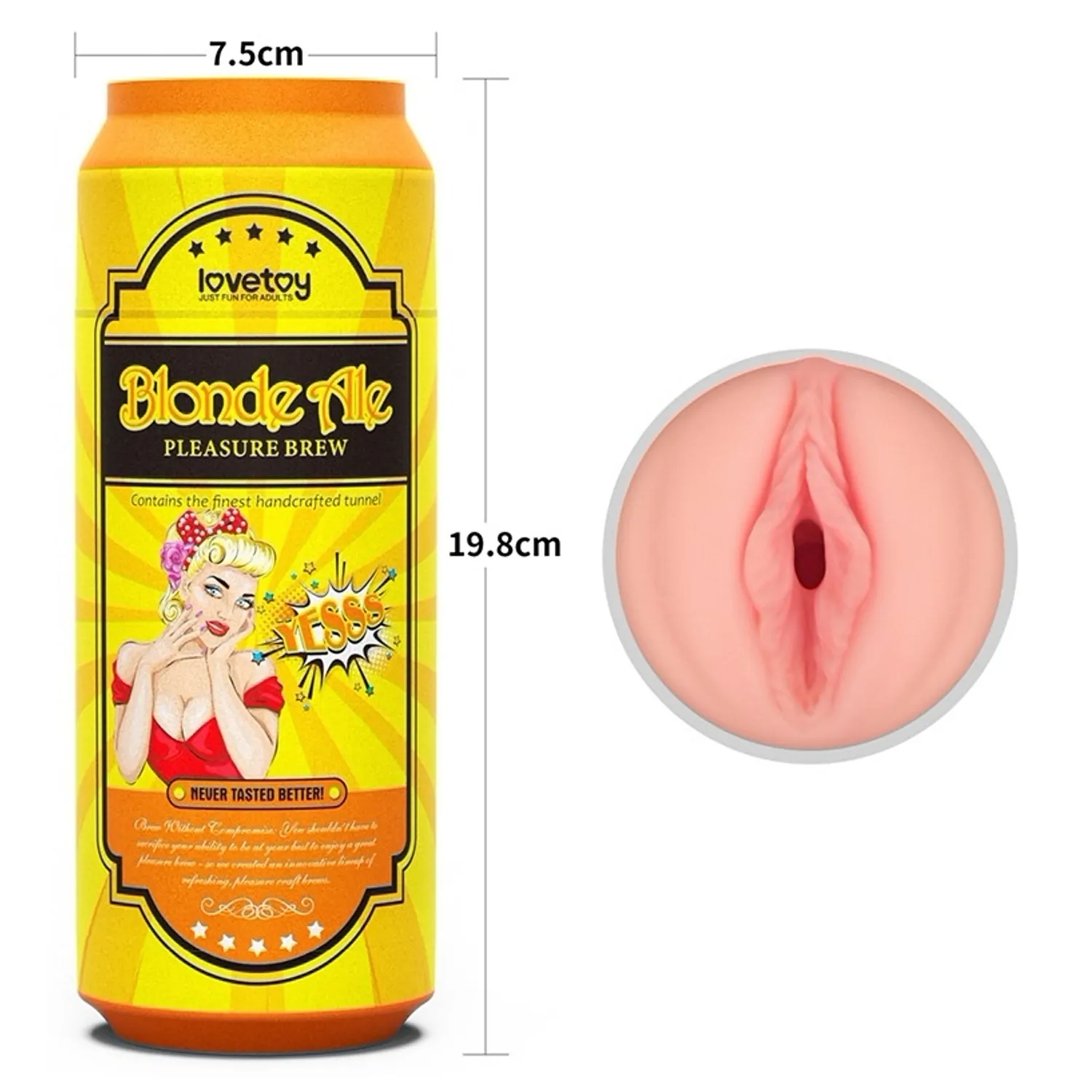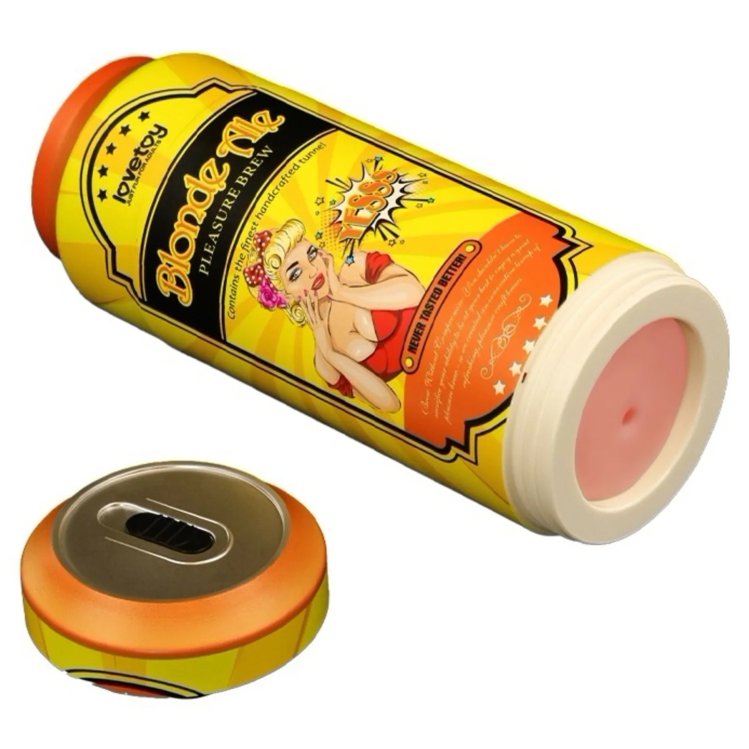 Masturbator compact LoveToy Plăcere Brew Blond Ale, din TPE moale şi flexibil, cu tunel texturat (ridicături, nodule şi inele). Extindere necondiționată 19.8 cm, diametru aprox. 7.8 cm. Fără ftalaţi şi latex. Curăţare uşoară; recomandat agent de ungere pe bază de apă.