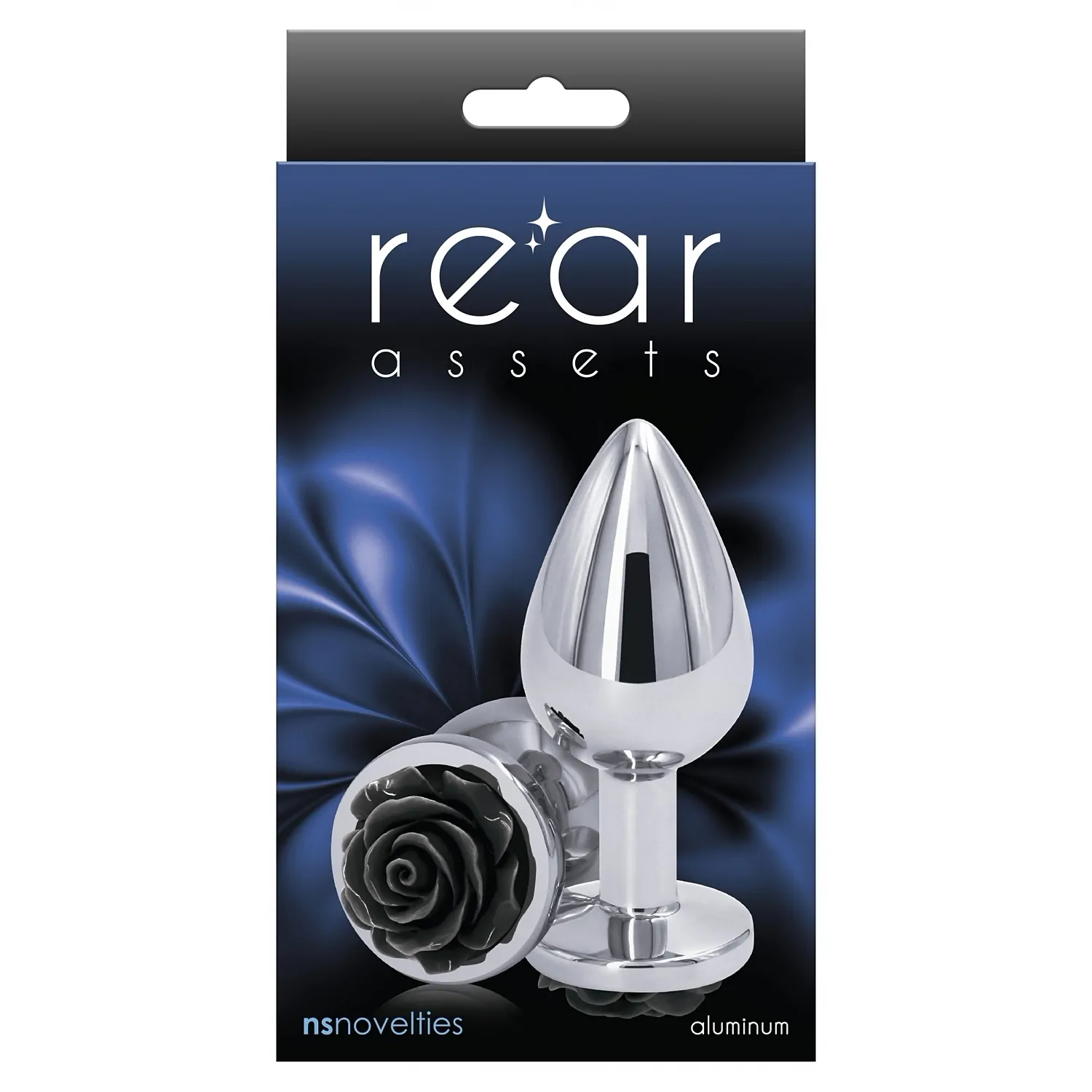 Dop anal Rear Assets Rose Medium, metalic (aluminiu cromat), 8,8 x 3,3 cm. Finisaj lucios, vârf conic pentru inserție ușoară, bază decorativă tip trandafir, viguros la apă și potrivit cu lubrifianți. Sigur pentru corp și ușor de curățat.