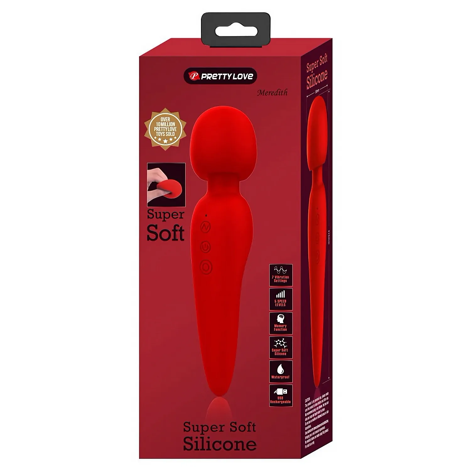 Wand Pretty Love Meredith: cap elastic din silicon moale, 7 feluri de vibraţie, cu acumulator şi 100% trainic la apă. Compact (21.5 cm) şi uşor de manevrat — ideal pentru baie sau duş.