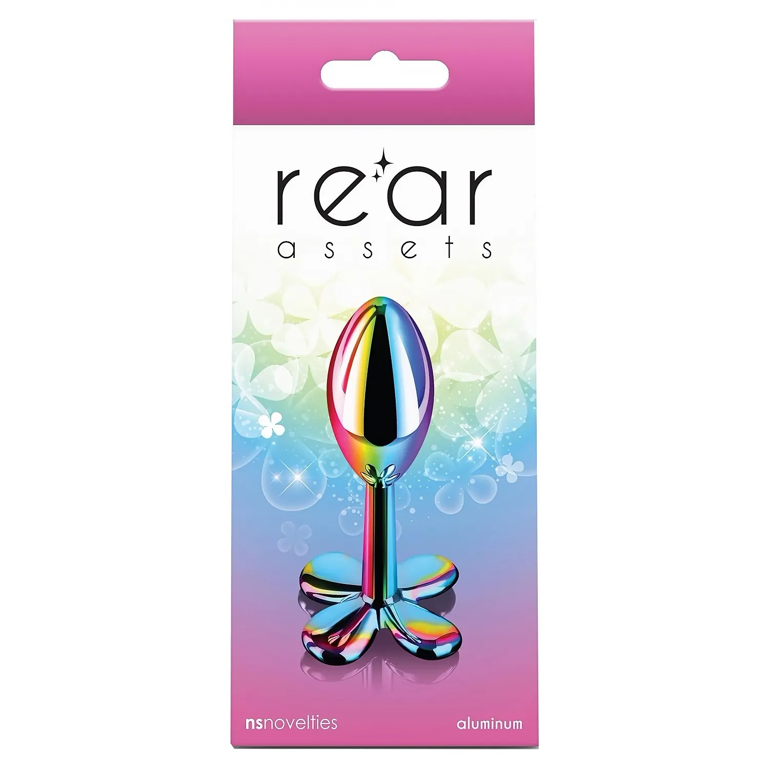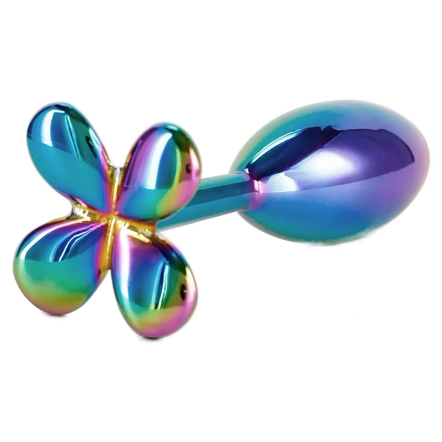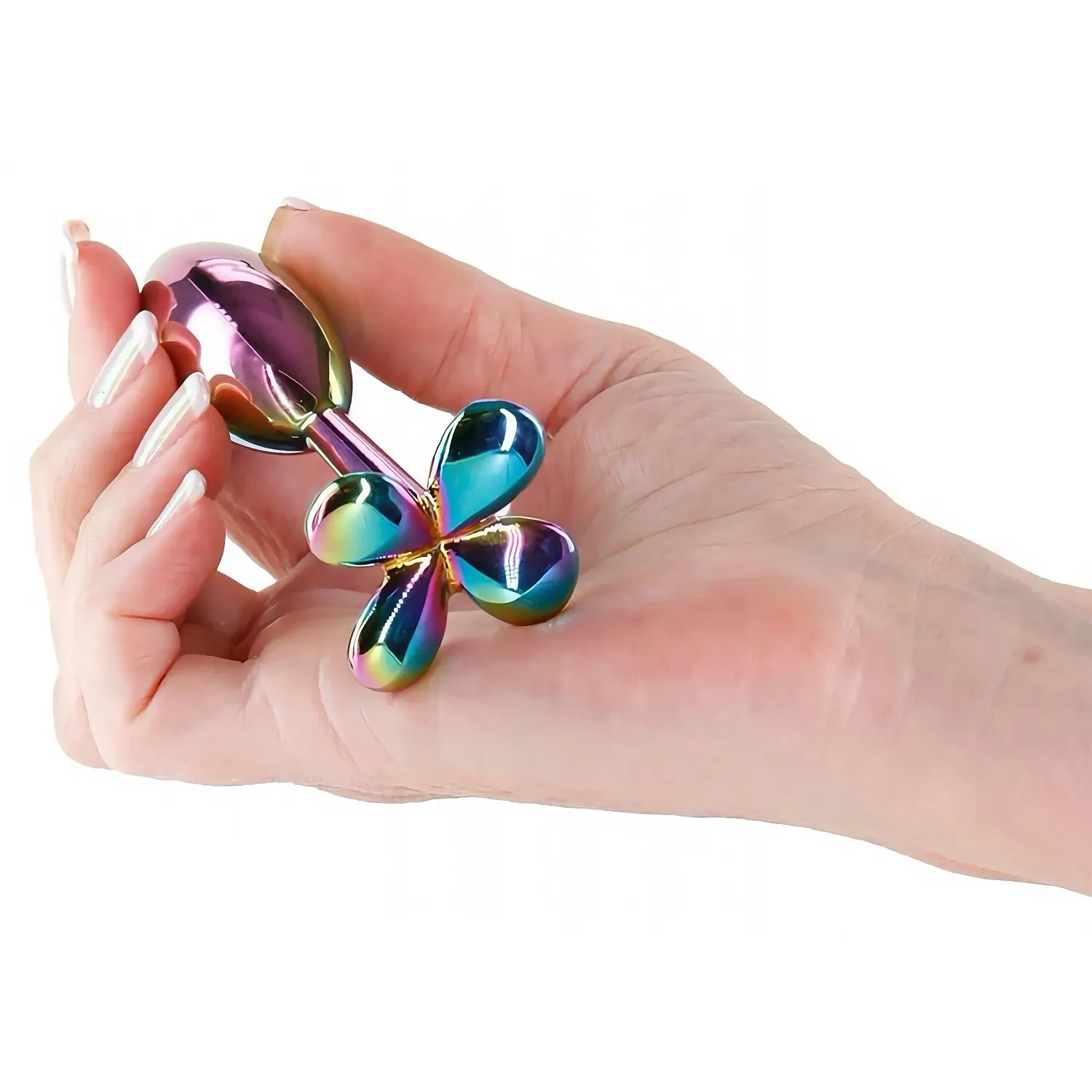 Dop anal metalic NS Clover, finisaj cromat multicolor. Bază în formă de trifoi cu 4 foi, estetică compact și ușor, sigur pentru corp. Aluminiu neted, potrivit cu absolut orice lubrifiant, ușor de curățat — desăvârșit pentru începători.