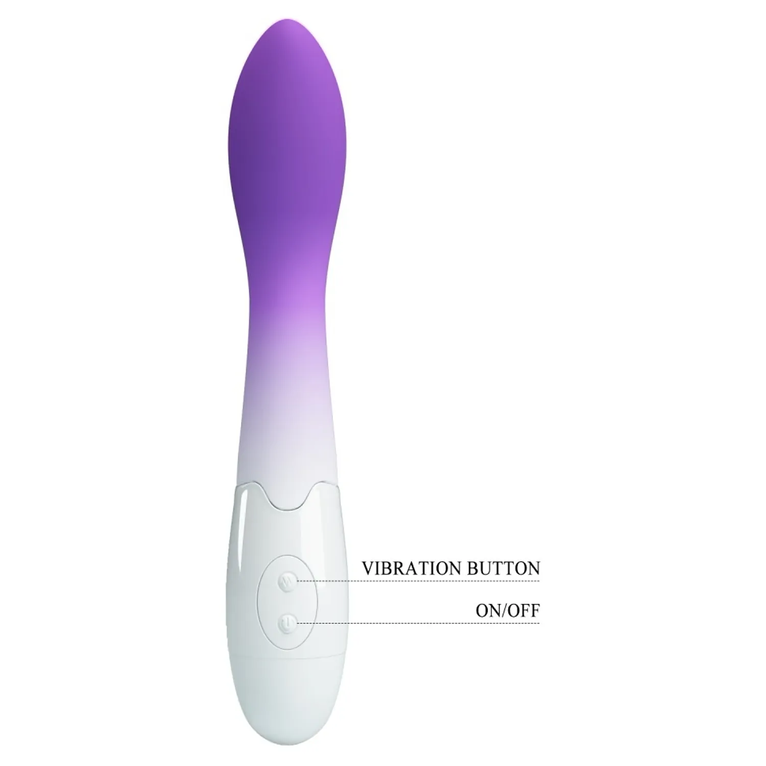Beneficii și atribute: - 30 maniere de vibrație pentru ajustare personală - Aspect curbată optimizată pentru punctul G - Cap rotund ușor bombat pentru stimulare precisă - Design ergonomic, manevrare confortabilă - Discret și ușor de utilizat, corespunzător pentru începători și avansați - Culoare: mov și alb