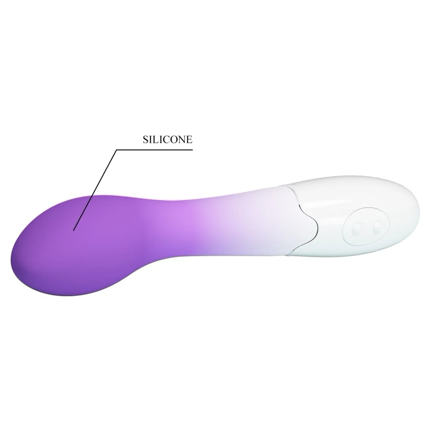Vibrator curbat Pretty Love Bishop, plămădit pentru stimulare precisă a punctului G. Cap rotund ușor bombat, formă ergonomică și 30 moduri de vibrație pentru ajustare fină. Culoare mov și alb; potrivit pentru începători și avansați.