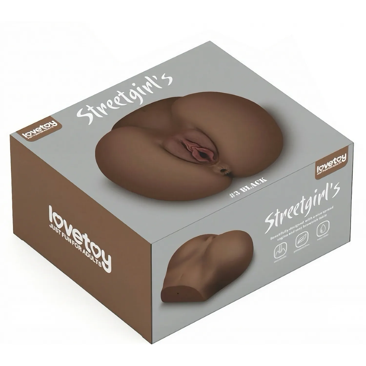 Masturbator Lovetoy Streetgirls #3, ciocolatiu. Două intrări texturate, tunel de frunte cu nubs fine și al doilea, mai strâns, cu curbe multiple. Fabricat din TPE sigur pentru corp, ultra moale, inodor și nonlipicios. Curățare ușoară; folosiți lubrifiant pe bază de apă.