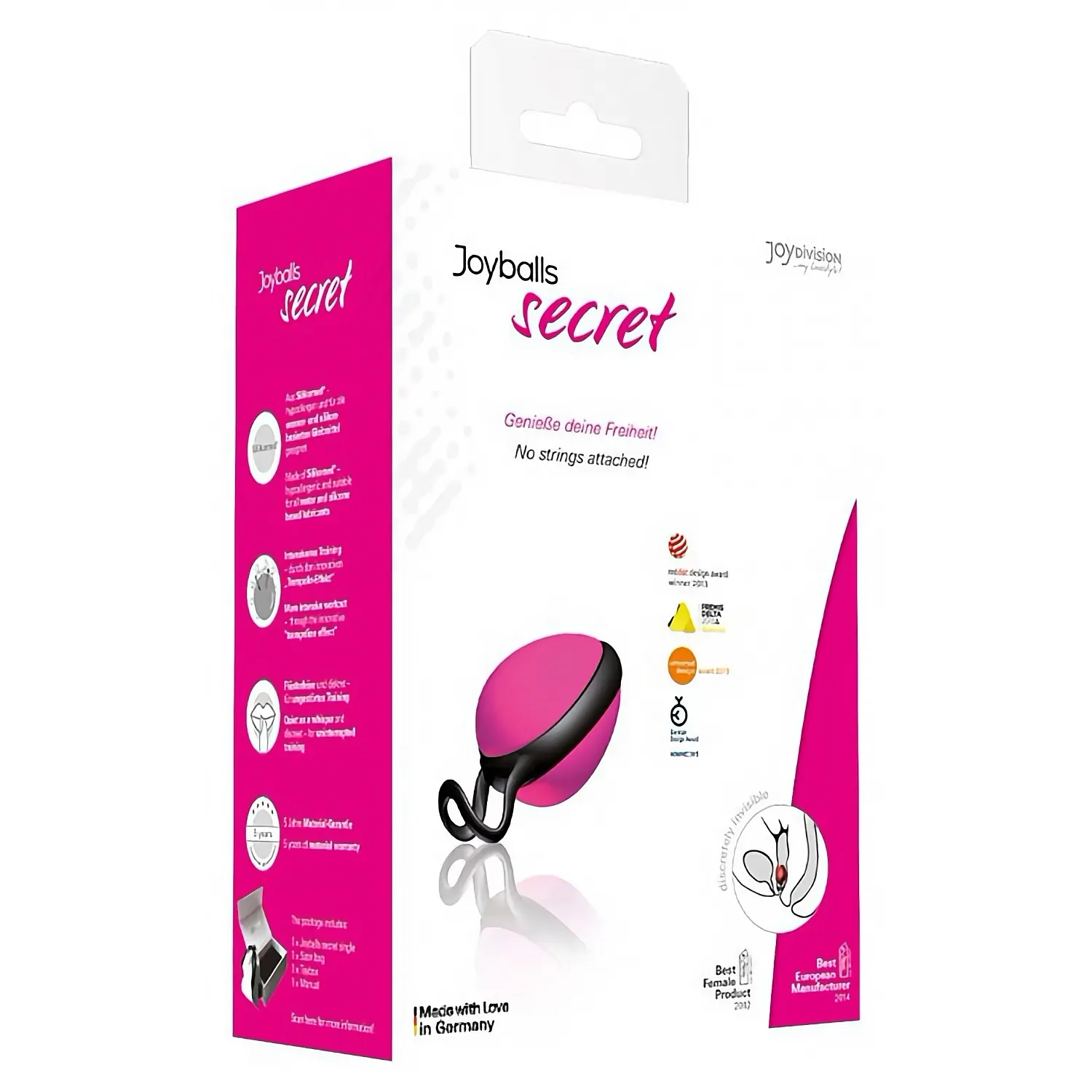 Joyballs Secret Single de la Joydivision este creată pentru antrenarea discretă a mușchilor pelvieni, oferind confort şi o utilizare invizibilă. Designul ergonomic şi tab-ul de retragere brevetat permit purtare discretă şi extragere simplă.