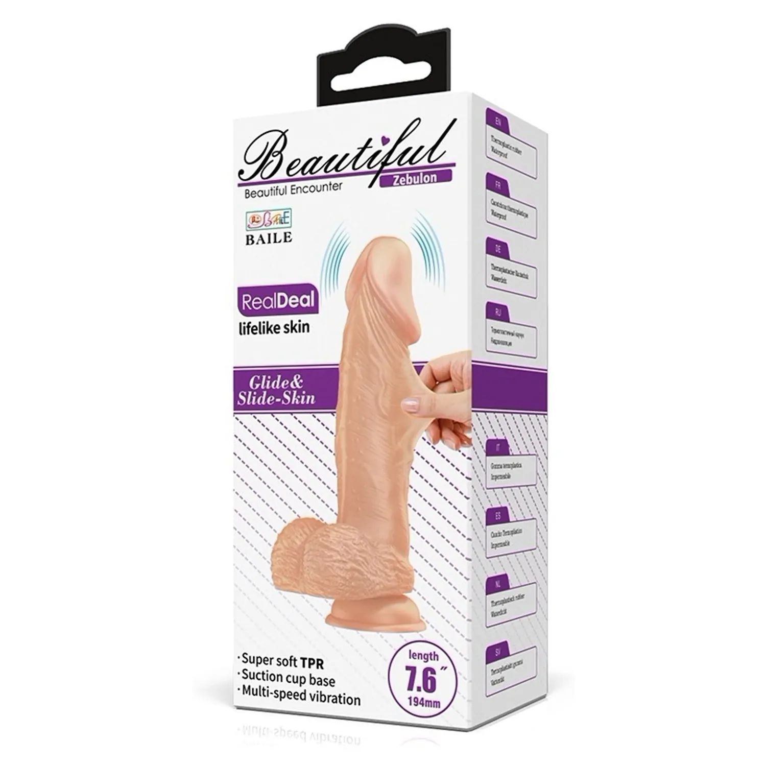 Vibrator realist Pretty Love Zebulon, 19,4 cm: exterior din TPR moale și miez ferm, ventuză intensă pentru utilizare hands-free și telecomandă cu fir pentru reglaj fin al vibrațiilor. Waterproof, ștergere ușoară.