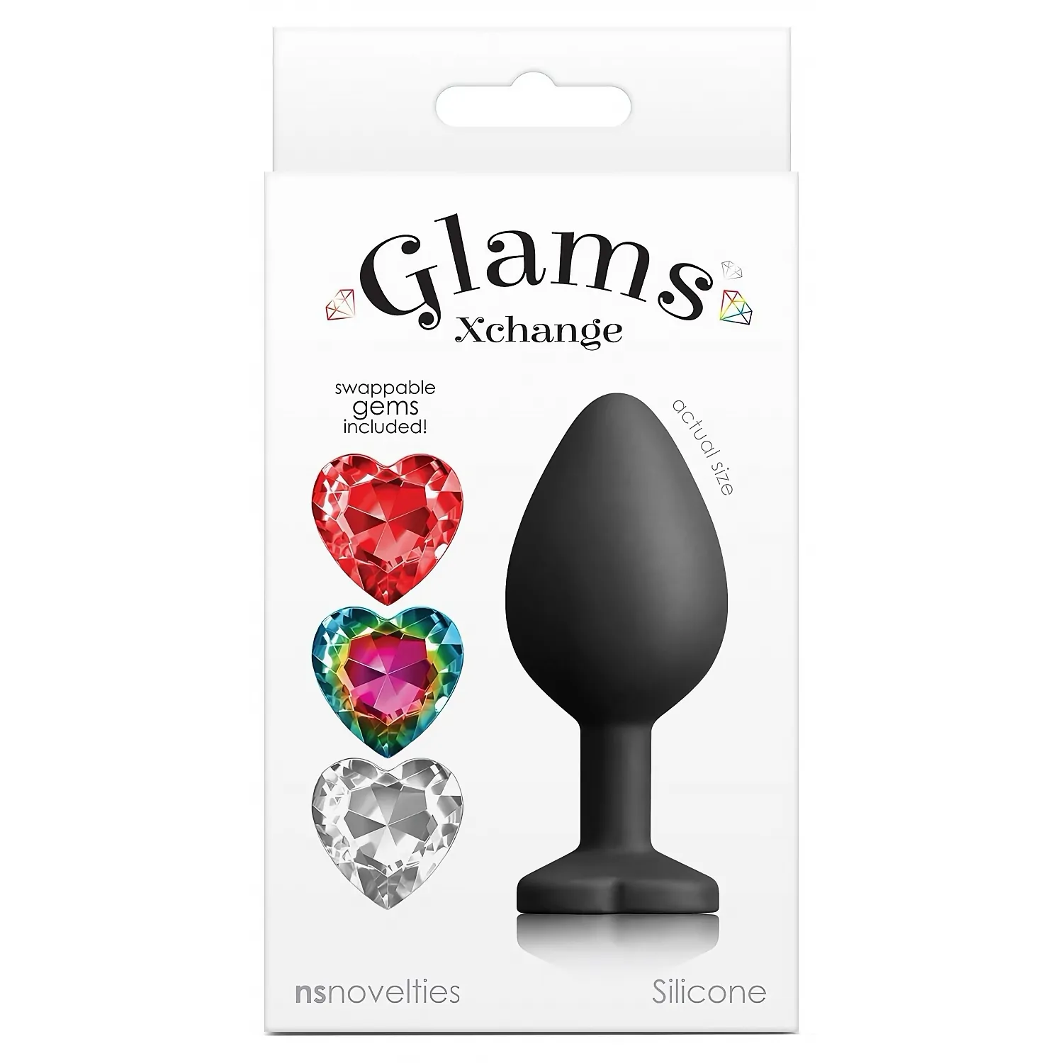 Dop anal Glams Xchange Heart Medium, din silicon premium, lungime 8.1 cm și calibru 3.5 cm. Vârf rotunjit pentru inserție confortabilă, trei pietre interschimbabile în aspect de inimă, rezistent la apă. Propus cu material lubrifiere pe bază de apă.