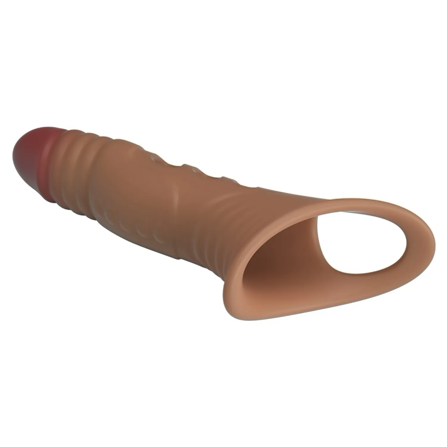 Extensie falus din TPE cu cap pronunţat, curea pentru testicule şi mini‑vibrator în manşon. Suplimentează volum şi extindere (21–25 cm), se fixează ferm pentru stabilitate. Material moale, textură realistă, culoare flesh.