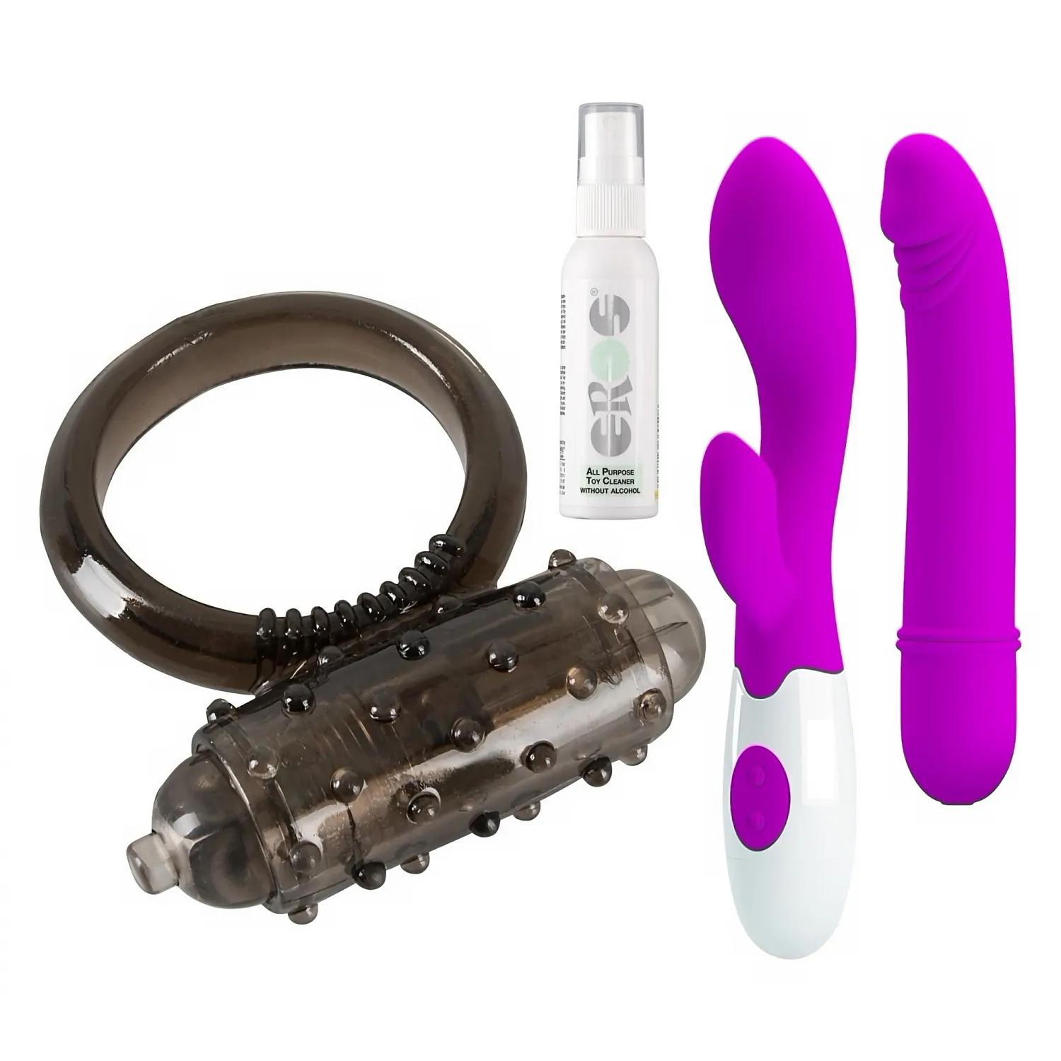 Kit-ul care modifică serile în trăiri intense: preludiu care încălzește, penetrare mai fermă și stimulare precisă. Produsele se completează perfect — inelul prelungește, două vibratoare oferă varietate, iar spray-ul păstrează totul curat și sigur.