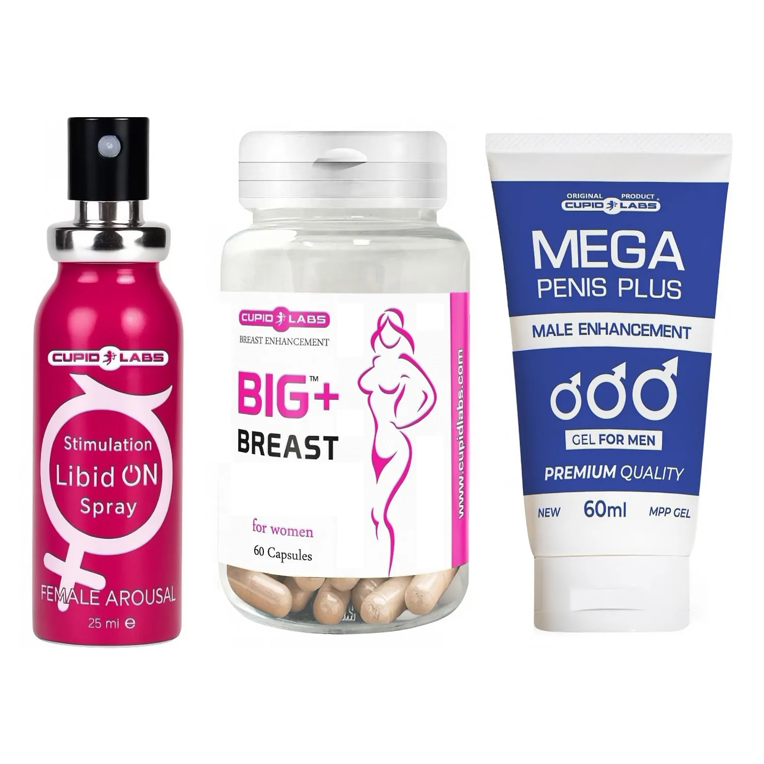 Set produs pentru serile în care vreți mai mult: adaos pentru fermitate și volum al sânilor, gel pentru extinderea și stimularea penisului și spray care amplifică sensibilitatea feminină. Se folosesc complementar — remediu zilnic, masaj și pulverizare cândva de preludiu.