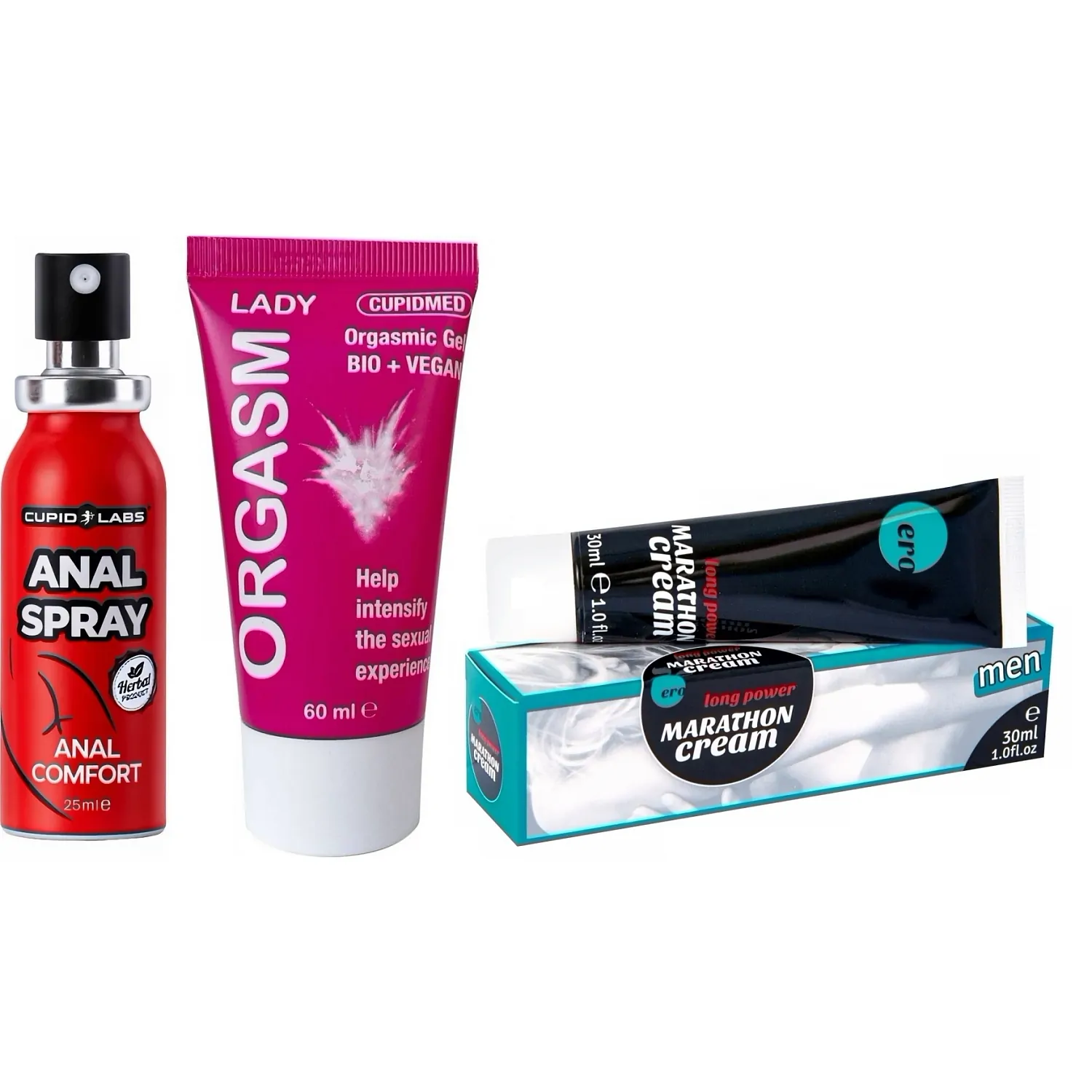 Un set perfect pentru nopți pline de senzații: confort în explorarea anală, impuls pentru dorința ei și rezistență pentru el. Se folosesc laolaltă în etape simple — crema pentru durată, gelul pentru excitație și sprayul pentru relaxare anală.