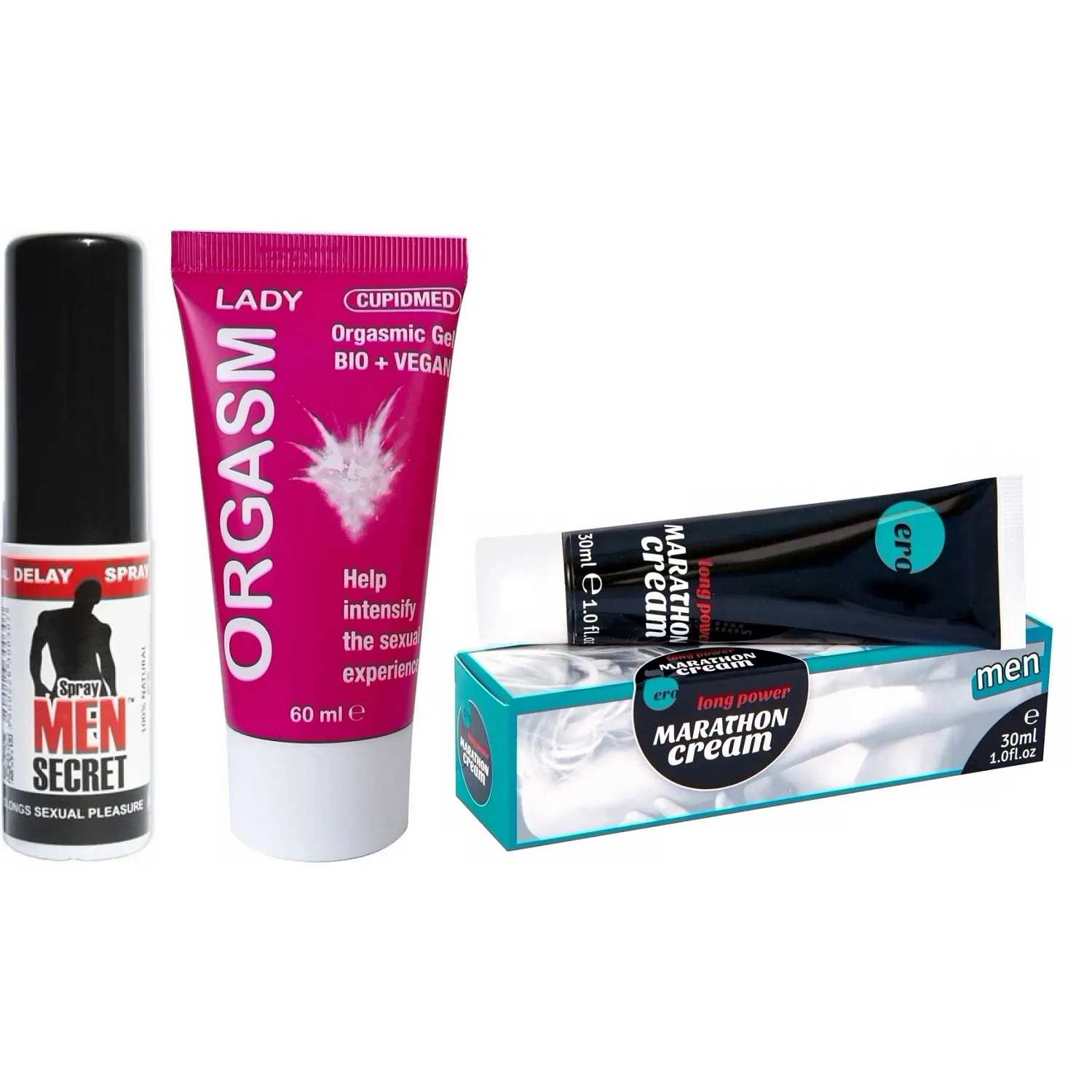 - Spray Men Secret (15 ml) — formulă licențiată, reduce hipersensibilitatea punctuală pentru a întârzia ejacularea și a lăsa controlul în brațele celui care îl folosește; eficace demonstrată clinic.