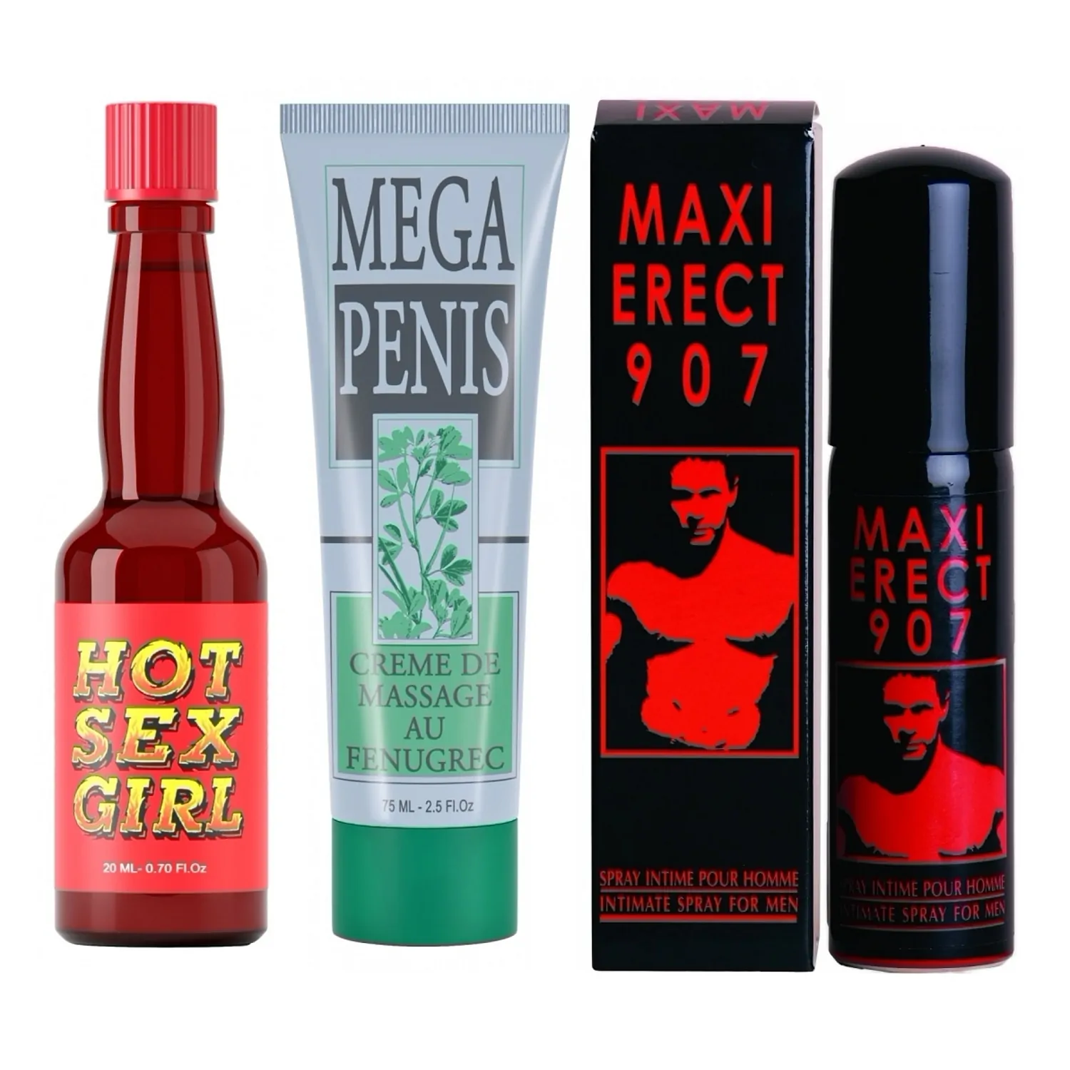 Set perfect pentru clipe pasionale: picături pentru mărirea dorinței ei, spray pentru sculare fermă și alifie pentru volum și fermitate. Utilizate împreună oferă preludiu intens, stârnire susținută și sesiuni mai lungi, confort și plăcere.