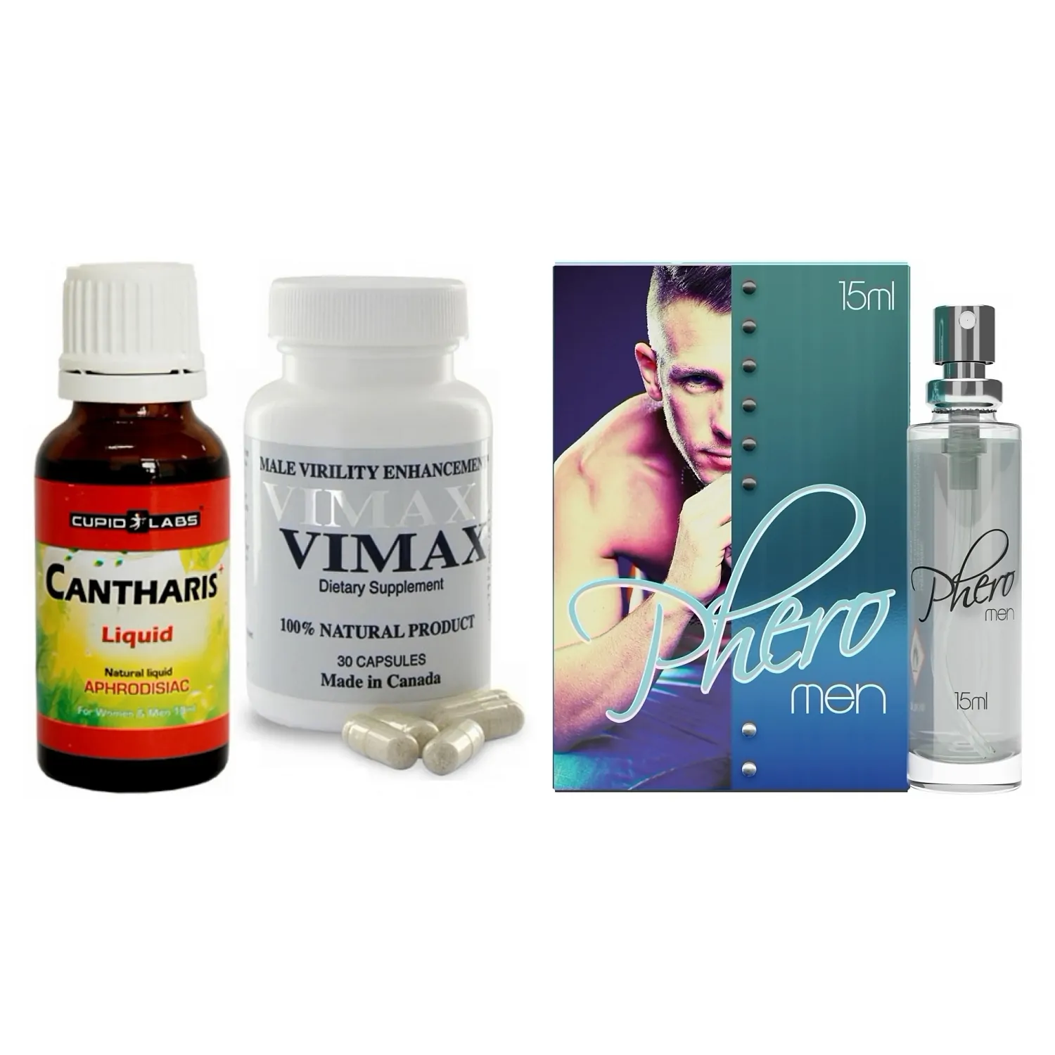 Un kit complet care intensifică dorința, mărește rezistența și amplifică atractivitatea. Tablete pentru reușită pe termen lung, picături pentru un impuls iute și parfum cu feromoni pentru impact imediat — folosite împreună, transformă absolut orice întâlnire intimă.