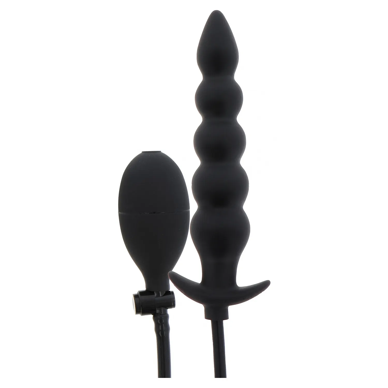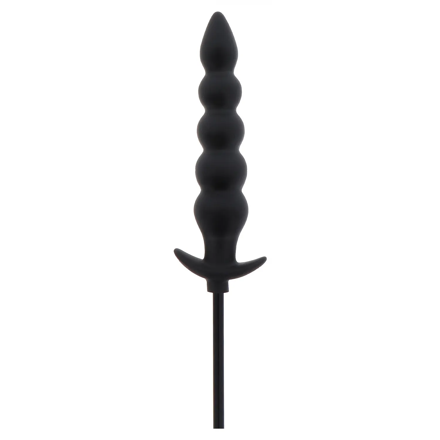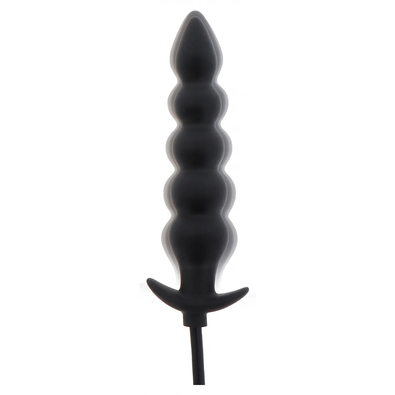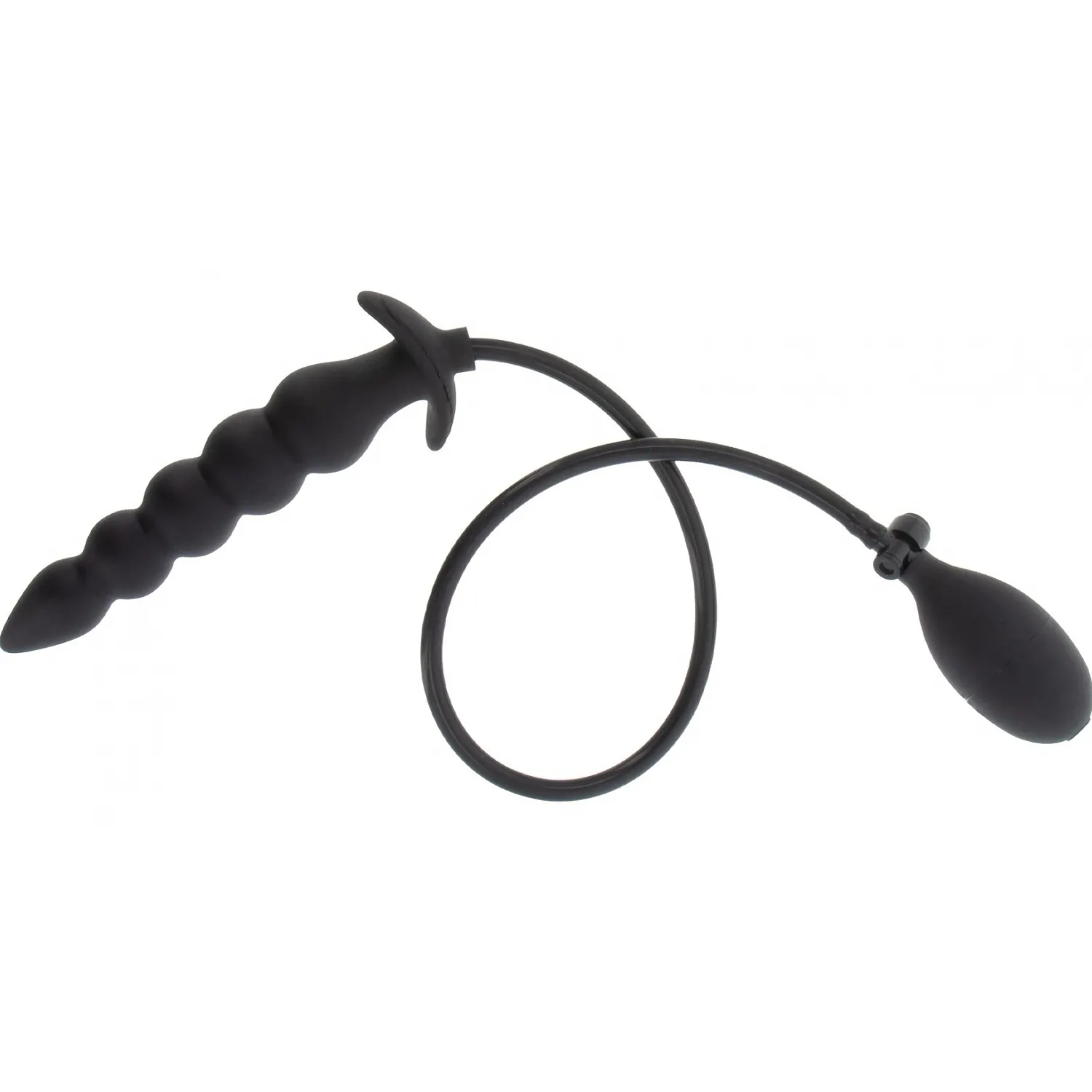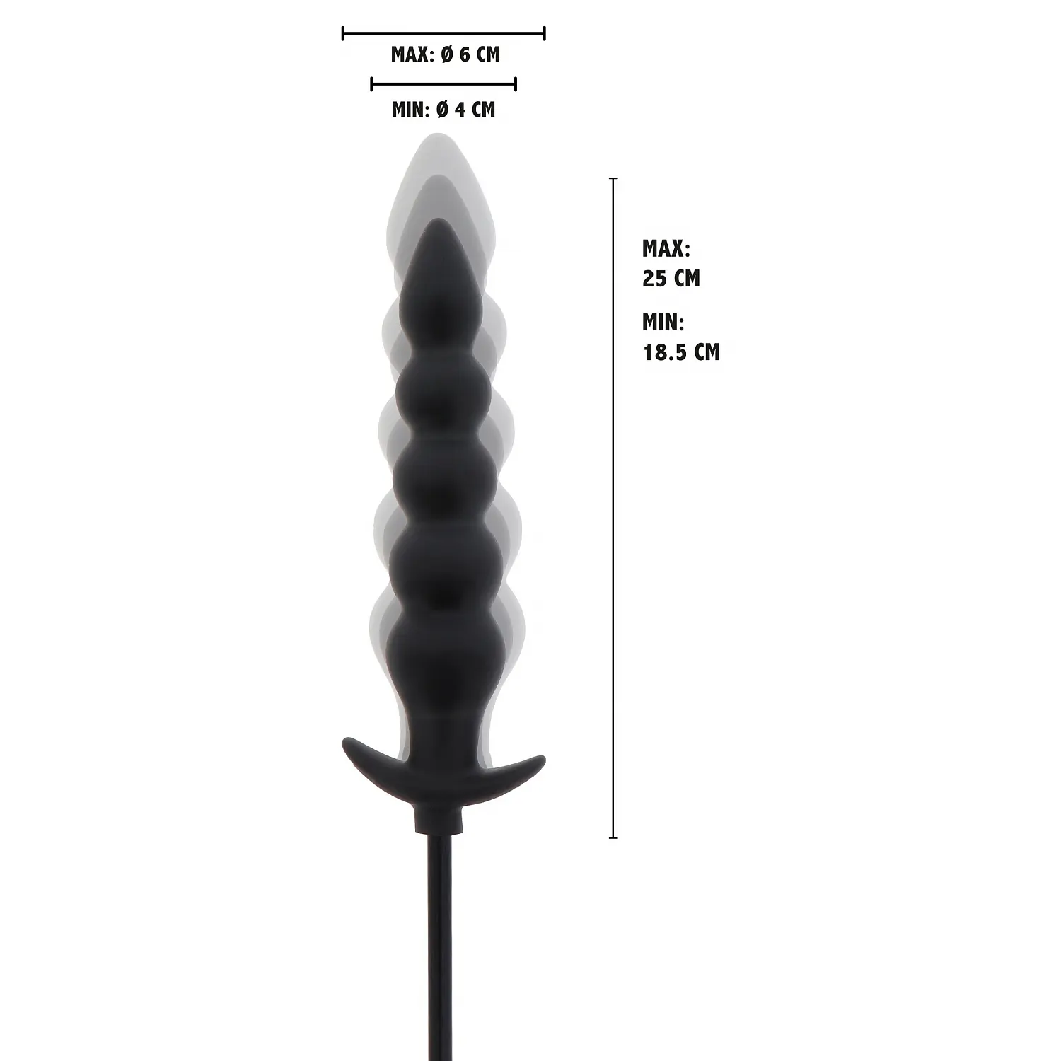 Plug anal gonflabil, din silicon 100% — striat, cu supapă grabnică de eliberare. Inserabil 18.5–23 cm, calibru 4–5.5 cm. Ajustează umflarea pentru senzaţie de plenitudine. Culoare: negru. Marcă: Hidden Desire.
