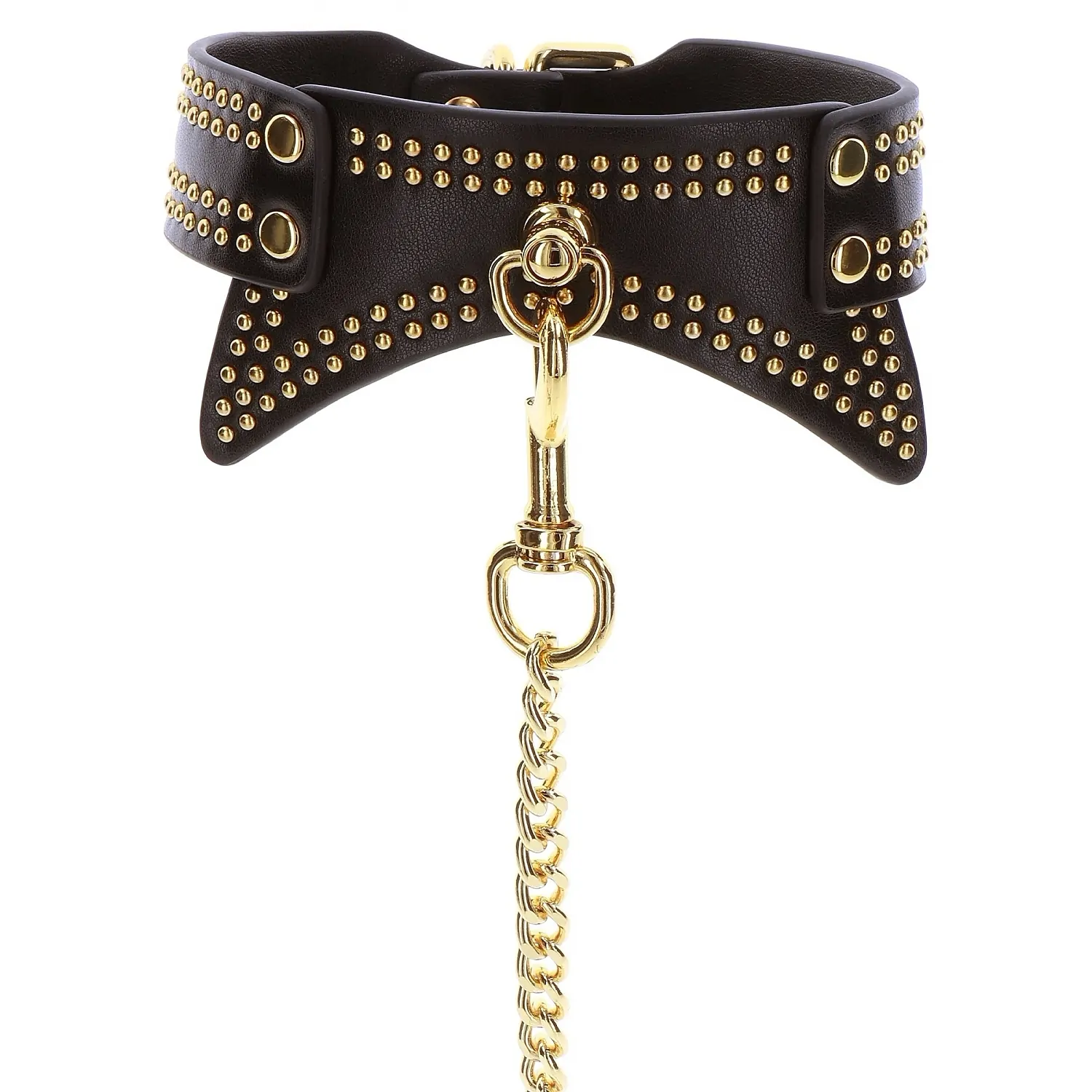 Set zgardă și lesă Taboom, negru cu nituri aurii, confecționat din tegument PU vegană și metal fără nichel. Zgarda reglabilă acordă fixare sigură și confort, iar lesa solidă garantează control discret în jocuri consensuale.