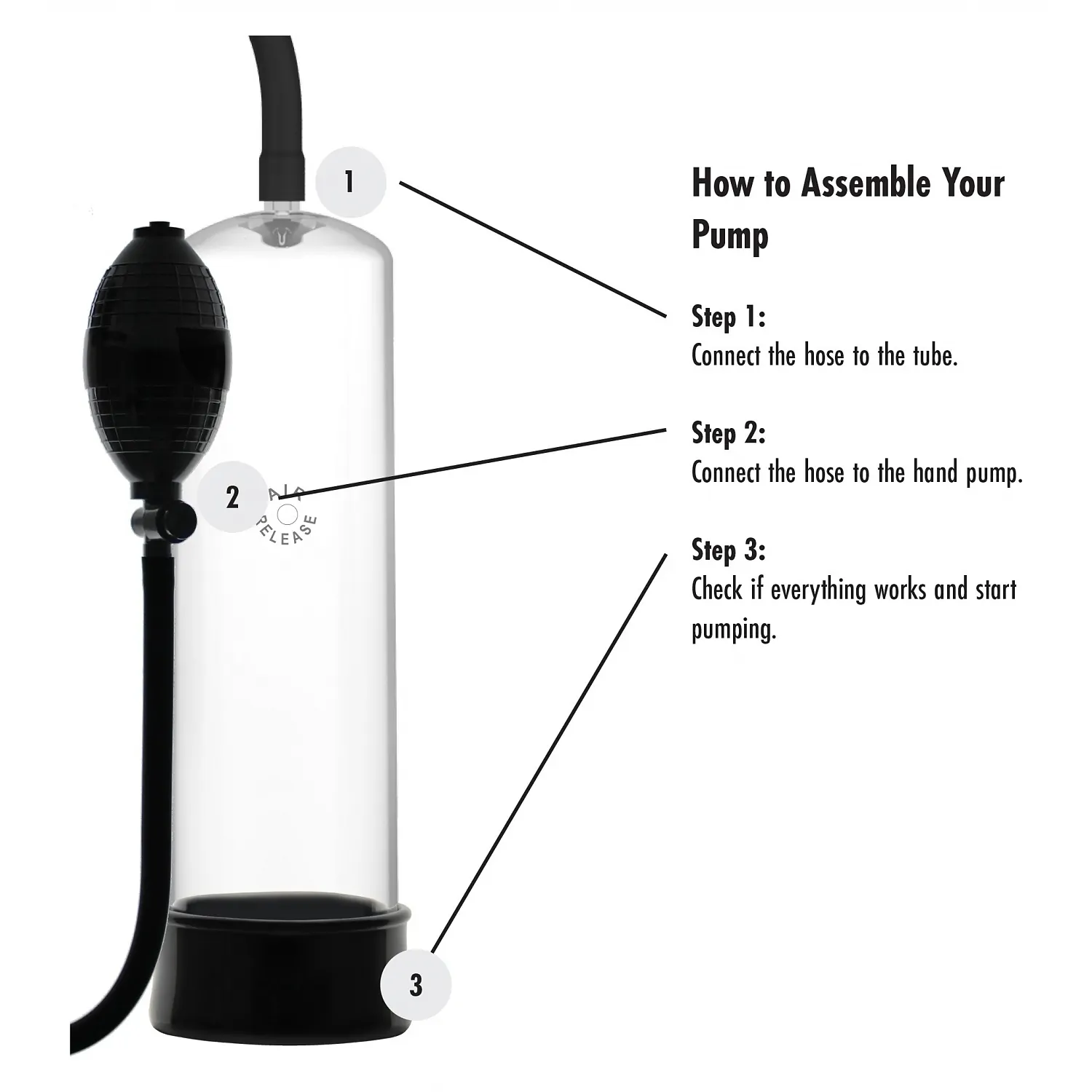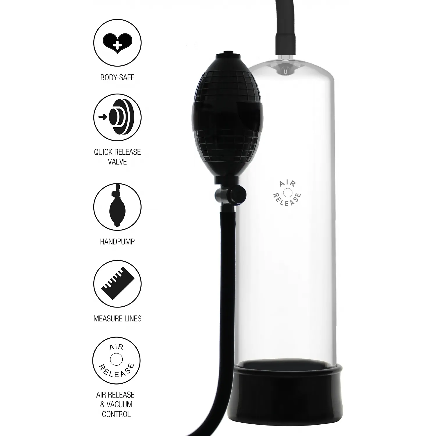 Beneficii și atribute: - Reglare precisă a presiunii prin bilă de pompare - Stil ergonomic optimizat pentru prindere stabilă și control - Tub transparent pentru monitorizare facilă - Manșon din silicon pentru confort și igienă - Fără ingrediente electrice sau vibrații, ideal pentru utilizare discretă - Instrucțiuni de întreținere incluse
