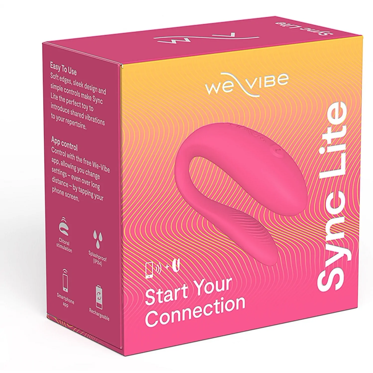 WeVibe Sync Lite Roz, stimulator compact cu acumulator cu 10 maniere de vibraţie, funcţie memorie şi control prin aplicaţie. Silicon medical, autonomie ≈45 min, încărcare 90 min, zdravăn la stropi (IPX4). Design elastic pentru stârnire clitoridiană, întrebuințare discretă şi hands free.