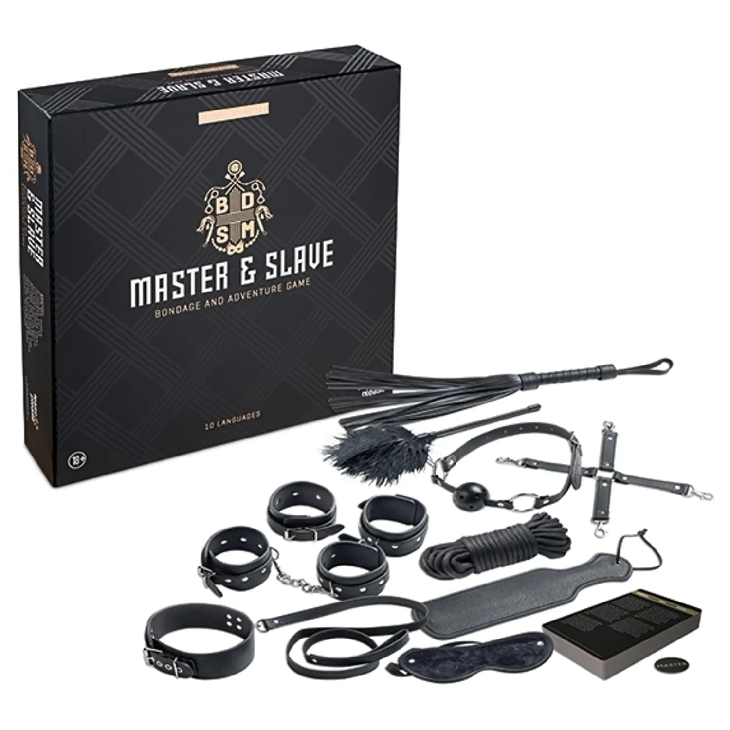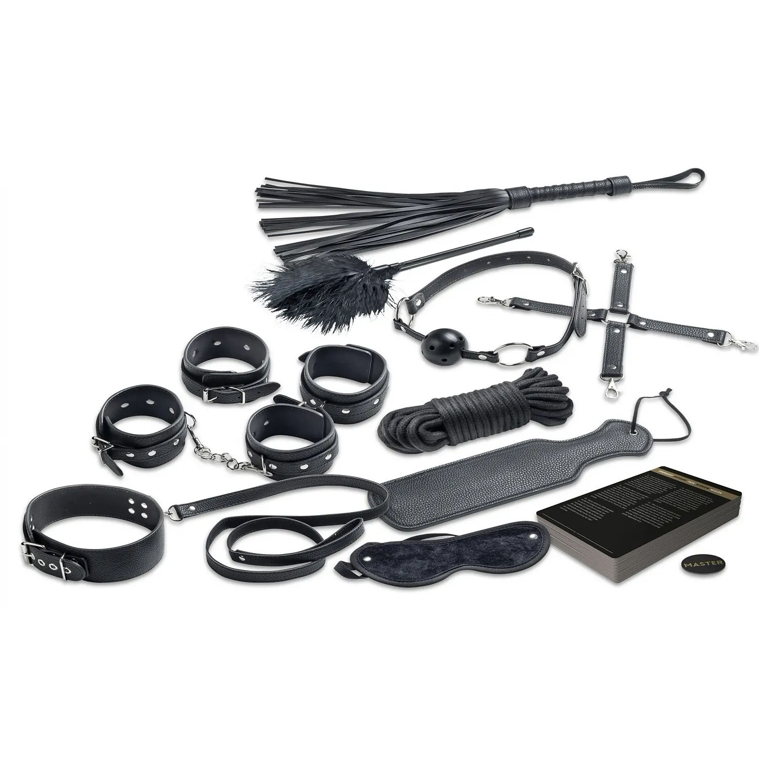 Set Master Submisie Deluxe de la Tease & Please, pachet perfect pentru jocuri de putere: bici, mască pentru ochi, padel, zgardă, pene, manșete pentru încheieturi și glezne, cordon și accesorii. 24 cartonașe cu instrucțiuni în 10 limbi.
