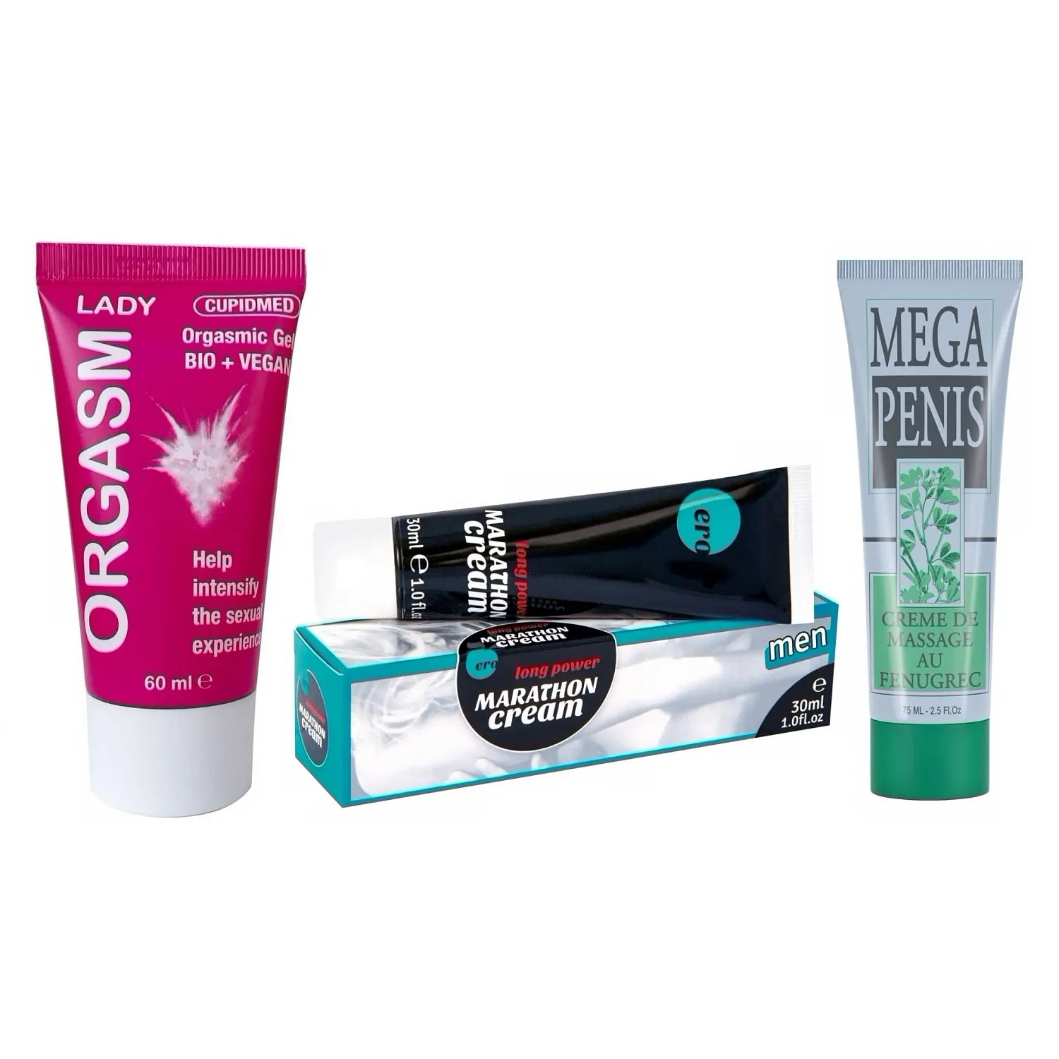 Set ideal pentru cupluri care vor să transforme preludiul și actul intim: sensibilitate crescută pentru ea, potență și rezistență pentru el, plus sprijinire pentru volum. Produsele se întregește simplu: gelul anterior jocului, crema Marathon cândva de atingere și Mega Penis în rutina zilnică.