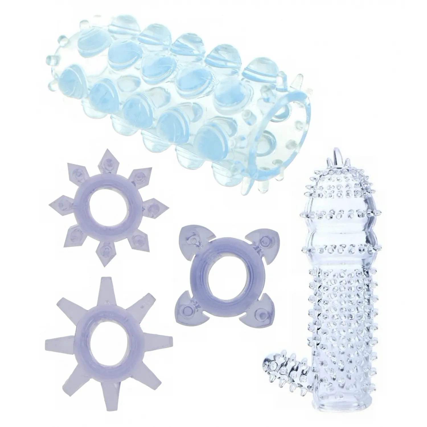 Cum le folosiți împreună: puneți unul dintre inele la baza membrului pentru a păstra fermitatea, apoi alegeți manșonul potrivit—cel albastru pentru o adaptare elastică și confort sporit sau varianta transparentă pentru texturi intense. Combinația îngăduie sesiuni mai destul de lungi și o penetrare cu senzații diferențiate. Începeți cu preludiu, aplicați un agent lubrifiere pe bază de apă pentru glidare optimă și montați accesoriile îndată ce sunteți relaxați.