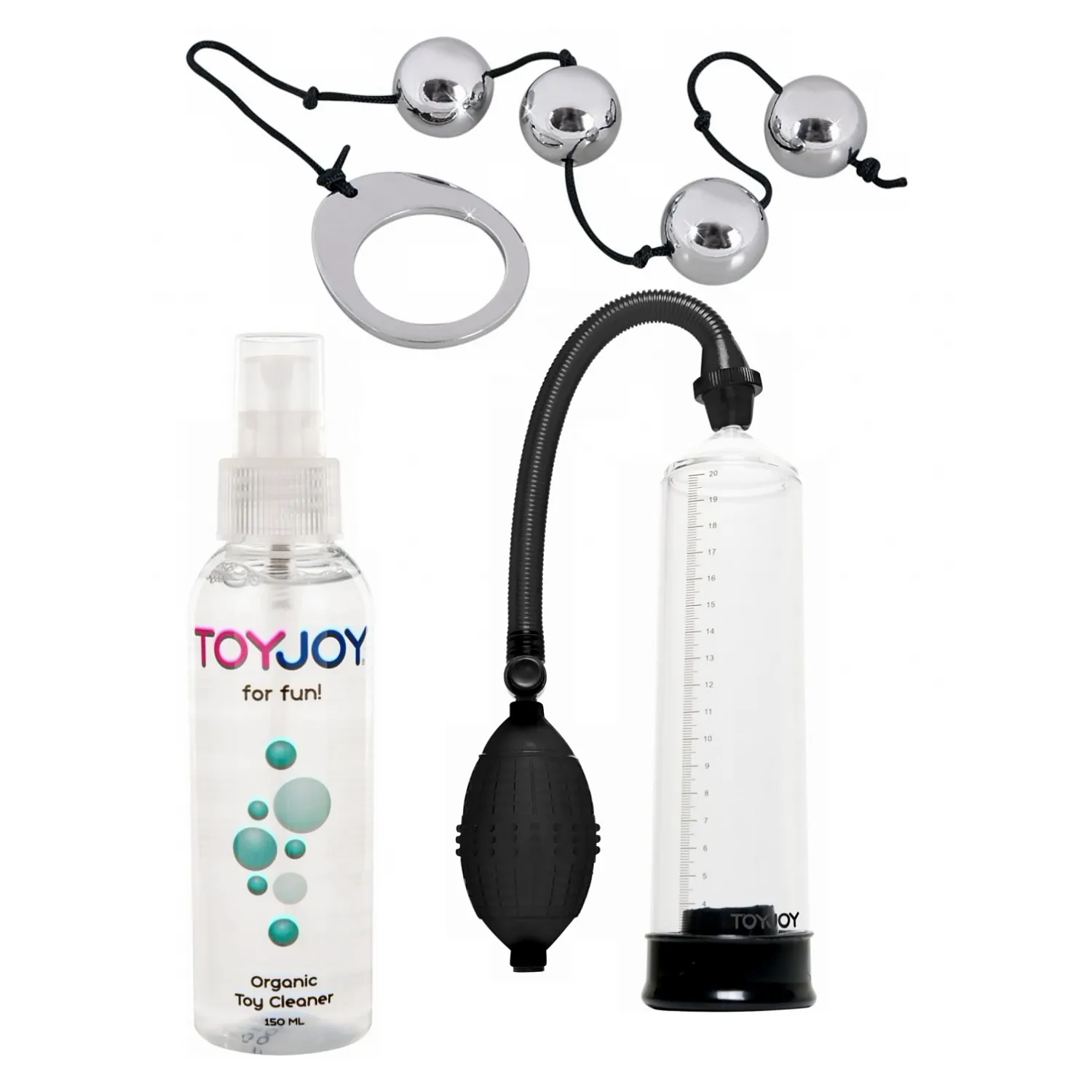 Redescoperă plăcerea cu un kit care curăță, amplifică și controlează. Spray-ul igienizează rapid, biluțele metalice aduc emoții profunde și pompa intensifică fermitatea — utilizate în secvență, crește preludiul și actul intim.