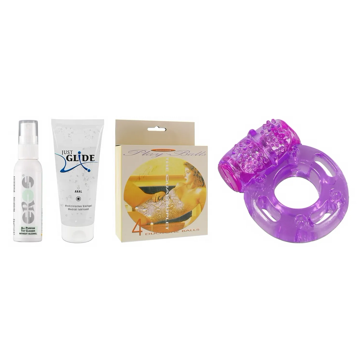 Un kit complet pentru trăiri mai profunde: bile vibrante, inel stimulativ, agent lubrifiere anal și atomizator de igienizare. Articolele se comasează pentru preludiu, sprijinire în timpul actului și curățare sigură — mai multă plăcere, lipsit de griji.