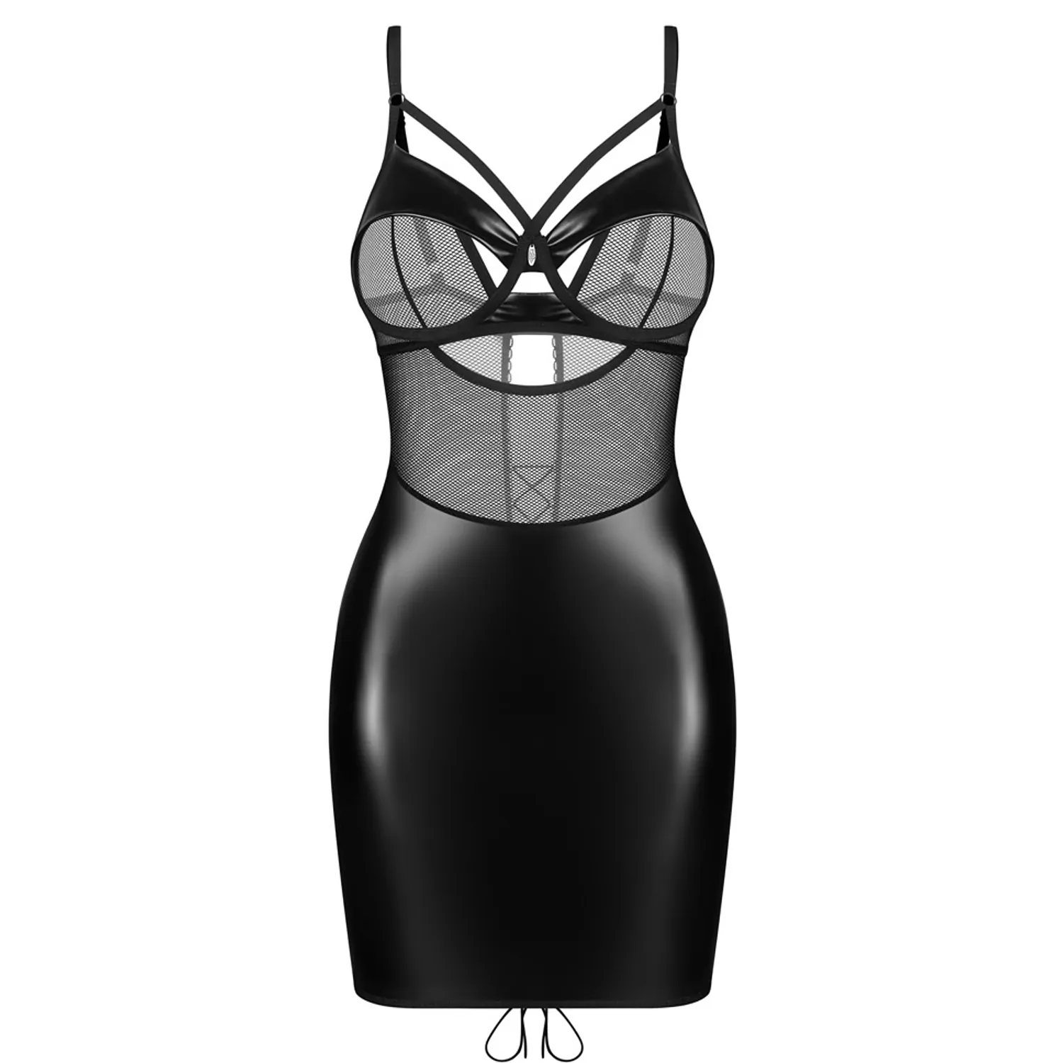 Setul Dominna de la Obsessive aduce un aer îndrăzneț și rafinat, corespunzător pentru ocazii când vrei să te simți puternic. Chemise-ul pune în valoare linia corpului prin asocierea de plasă transparentă în componentă superioară și wetlook opac în partea de jos.