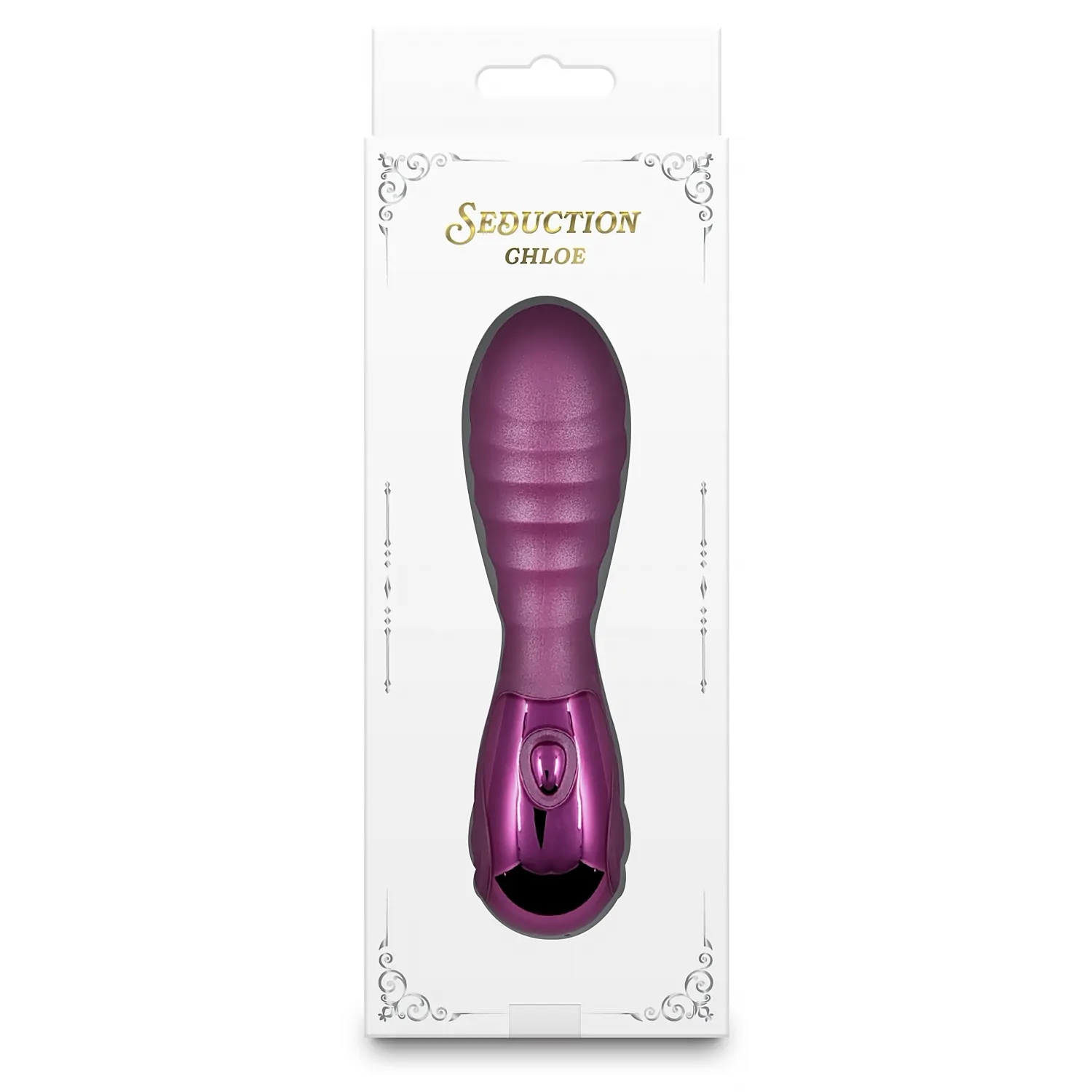 Mini vibrator Seduction Chloe: formă ondulată pentru stârnire precisă, silicon hipoalergenic, mâner metalic. 3 viteze și 7 funcții, cu acumulator USB și rezistent la apă. Compact, discret și facil de curățat. Compatibil cu lubrifianți pe bază de apă.