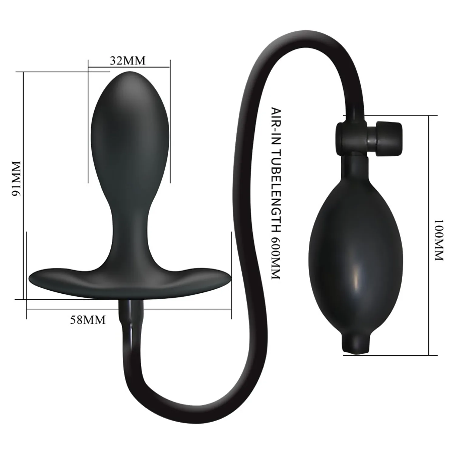 Plug anal Debra, gonflabil și reglabil: controlezi presiunea după inserare pentru confort personalizat. Supapă de siguranță pentru dezumflare rapidă; aerul se distribuie uniform pe ax. Nu umflați cândva de inserare. Material: silicon, culoare negru.