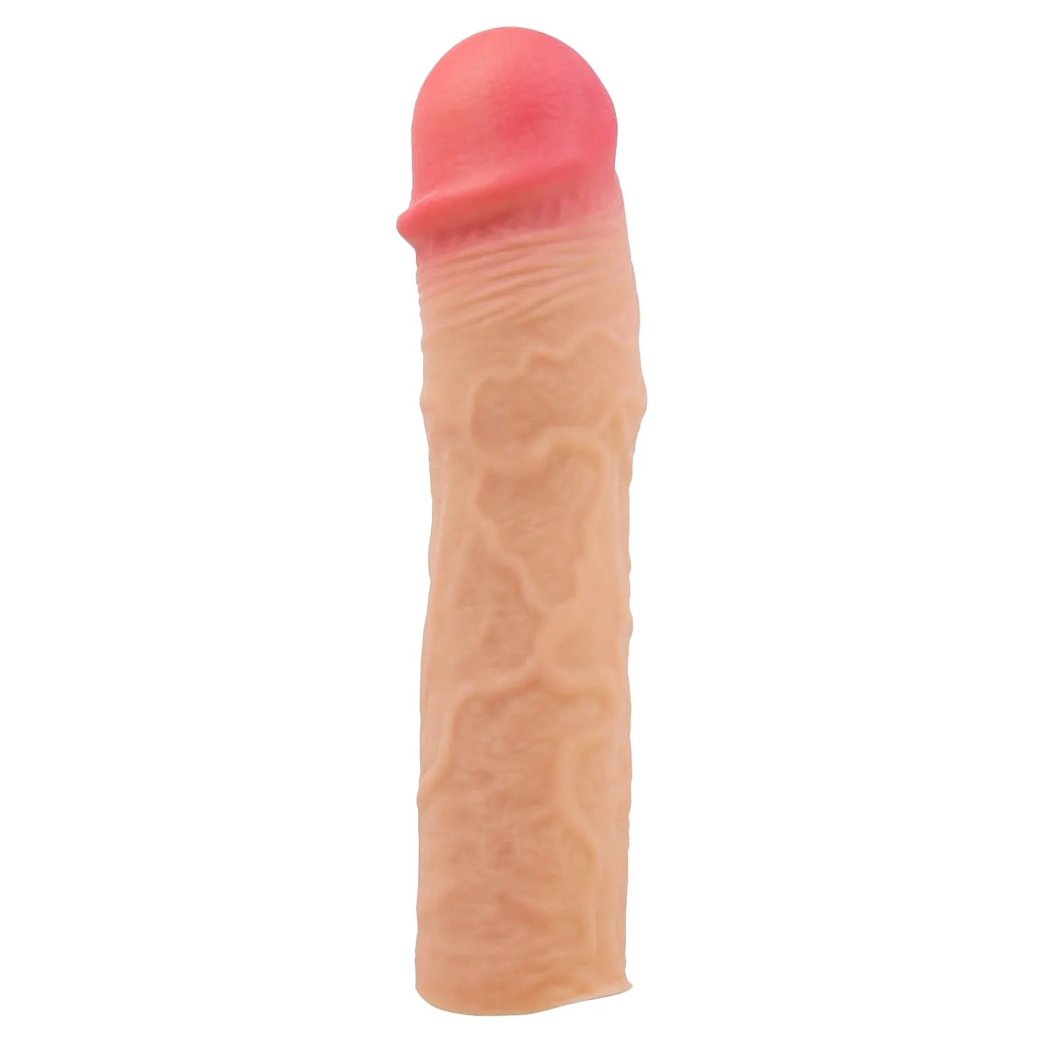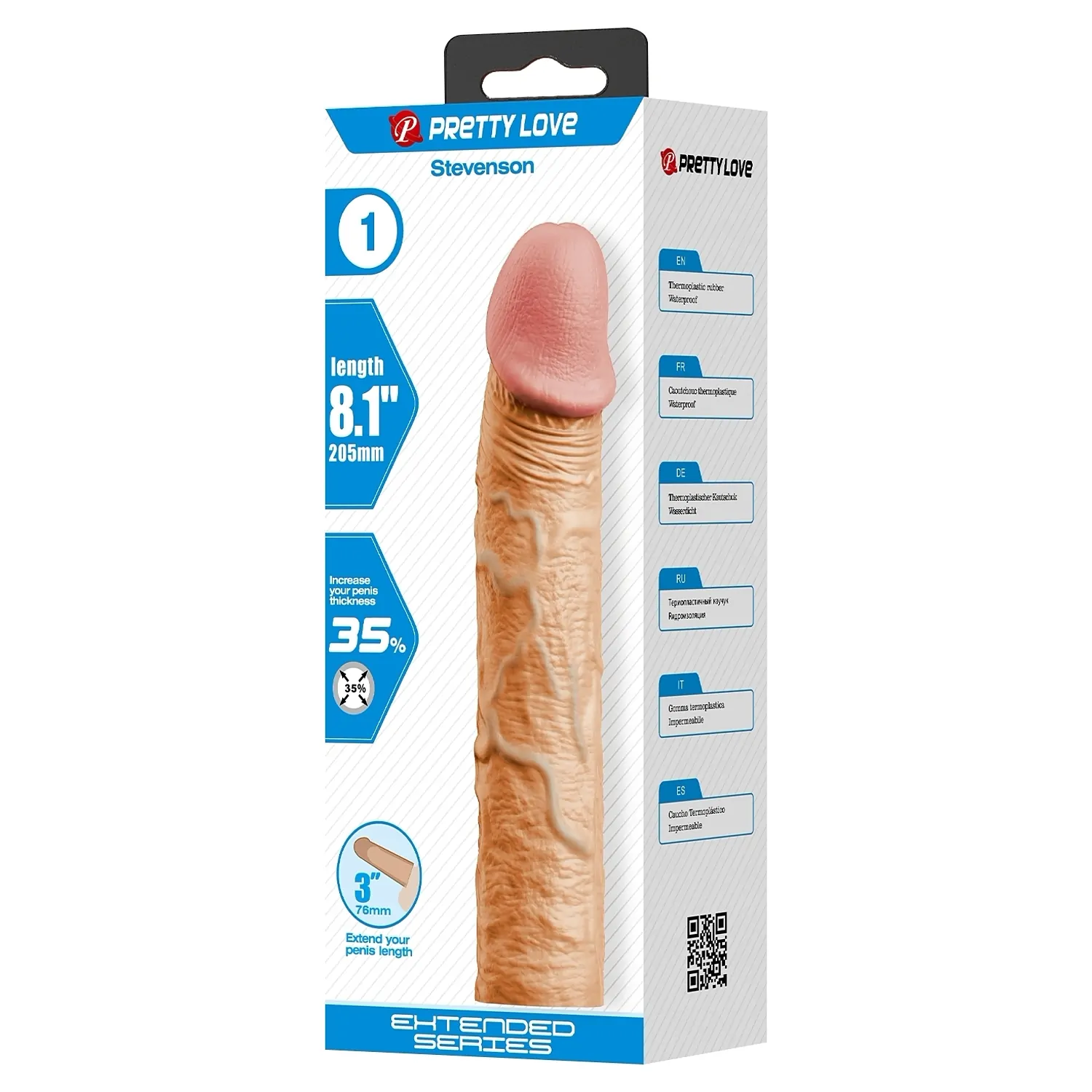 Manșon extensie Pretty Love Stevenson din TPR ultra-realist, mărime 20,5 cm, cu vene texturate și cap rotunjit. Interior moale pentru contact maxim și stimulare. Rezistent la apă; culoare maro (flesh).
