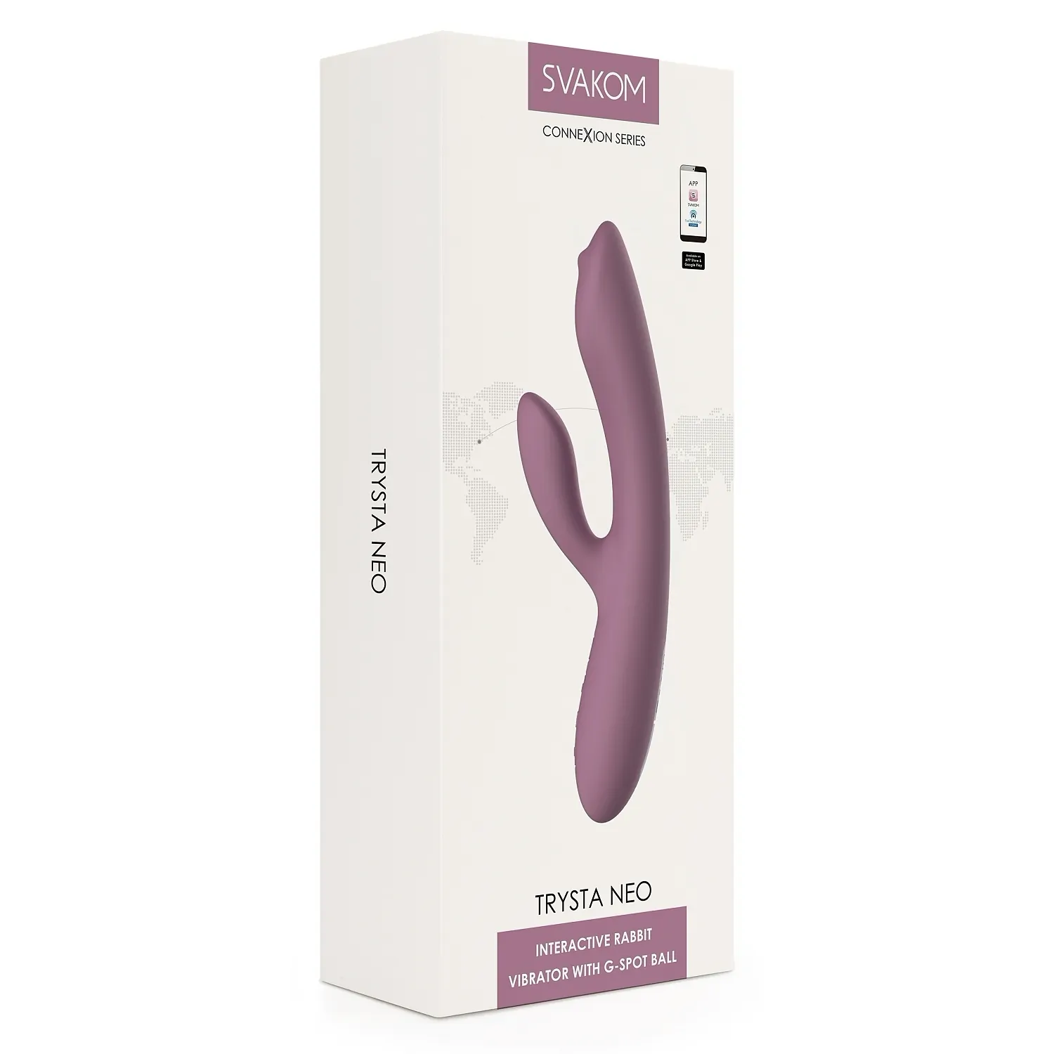 Svakom Trysta Neo, vibrator tip rabbit reîncărcabil: bilă rotativă 3 viteze pentru stârnire G, stimulator clitoral independent, 5 maniere x 5 intensități + mod Inteligent. Bluetooth compatibil SVAKOM/FeelConnect, silicon lichid, zdravăn la apă, memorie și travel lock.