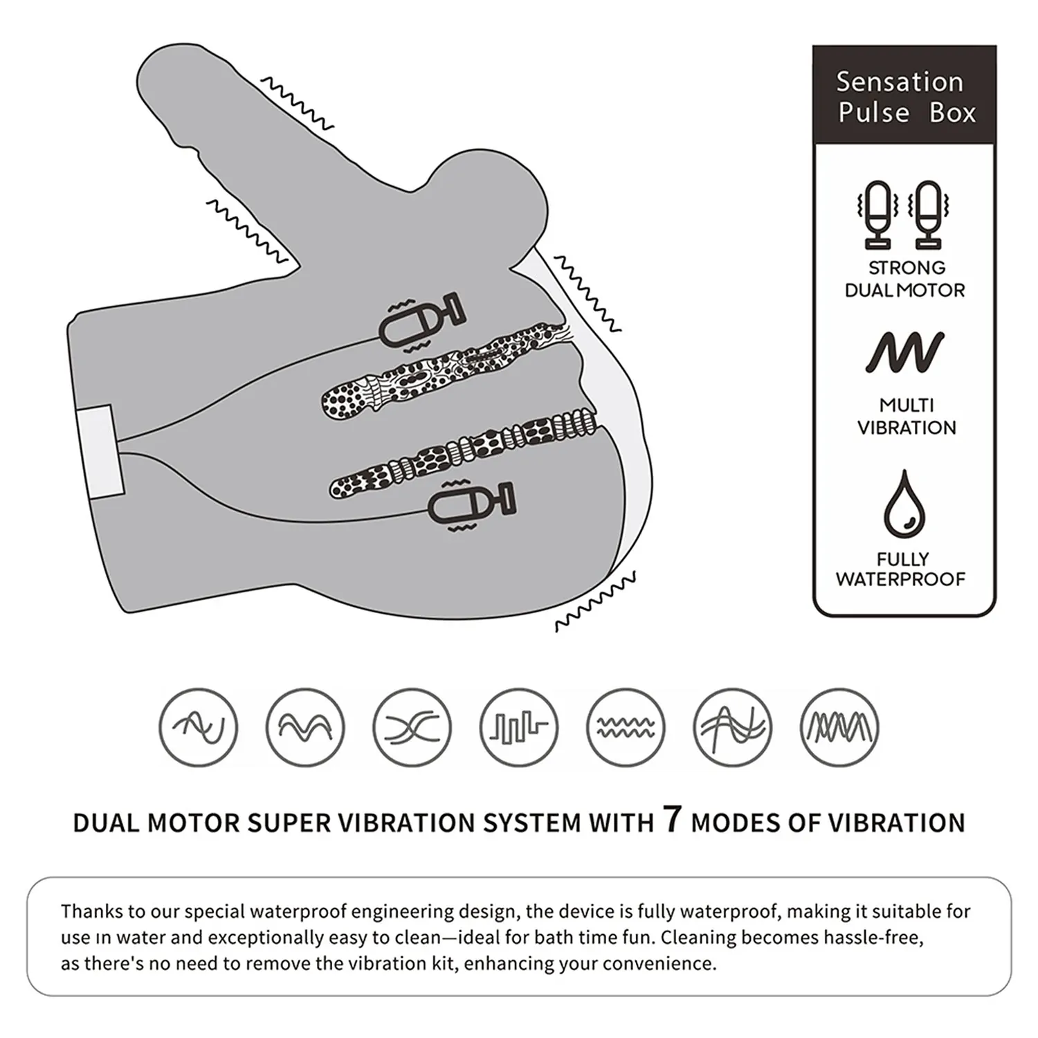 Carcasa include un canal creat concret și un dildo integrat, pentru emoții convingătoare și consistente. Produsul este complet rezistent la apă, ceea ce îl face potrivit pentru utilizare în medii umede și foarte lezne de curățat — nu este neapărată demontarea modulului de vibrație.