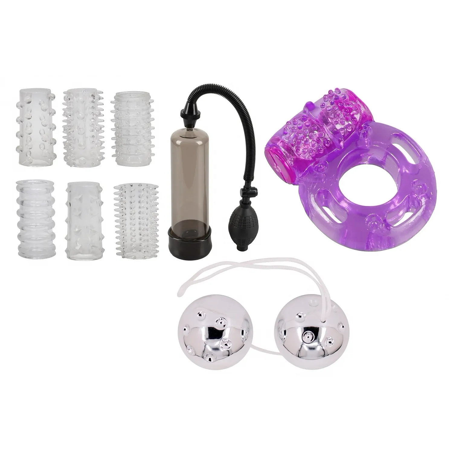 Set complet pentru încredere și emoții sporite: antrenează, tonifică și crește actul intim. Pompă pentru volum, bile pentru tonus pelvin, inel vibrator pentru susținere și manșoane texturate pentru variație — folosite laolaltă cresc controlul și plăcerea.