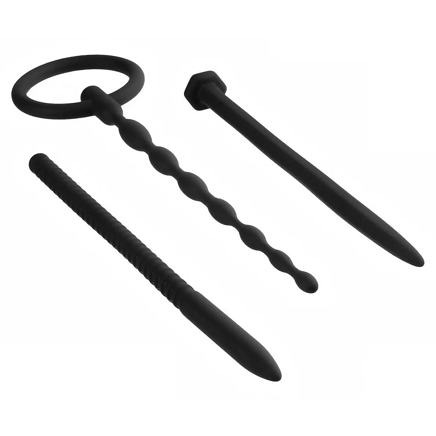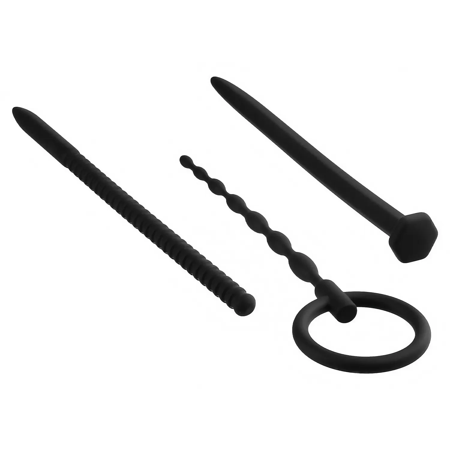 Set discret Nmc, 3 dilatatoare uretrale din silicon pentru progres treptat. Dimensiuni precise: 12,5 cm (cu inel, diametre 0,3–0,8 cm), 15,0 cm şi 15,2 cm (diametru 0,8 cm). Finisaje neted şi striat. Curăţare simplă; folosiţi agent lubrifiere pe bază de apă.