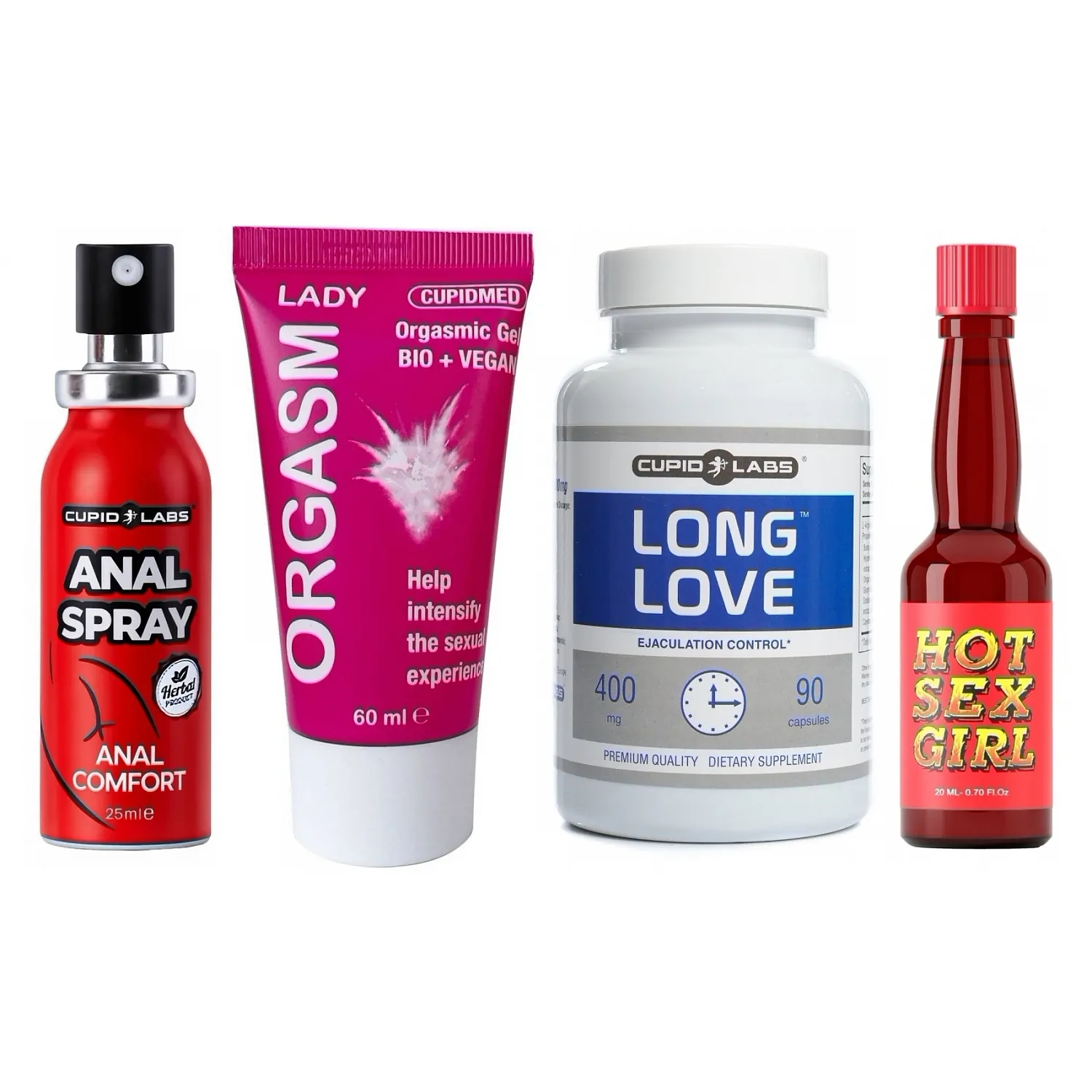 Un set perfect pentru nopți umplute de pasiune: control pentru el, stârnire pentru ea și curaj pentru a explora. Produsele se folosesc complementar — pilule pentru prelungire, gel și picături pentru amplificarea senzațiilor și spray pentru confort anal.