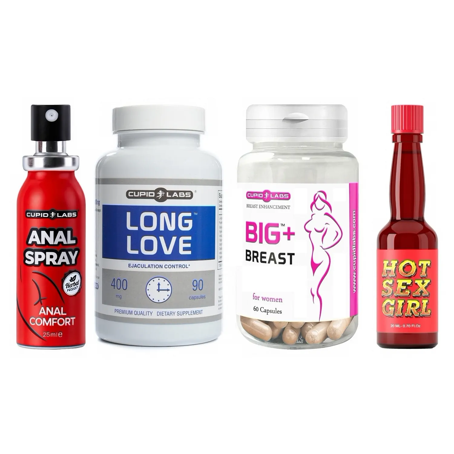 Acest pachet reunește patru soluții complementare pentru a transforma intimitatea: un adaos pentru fermitate și volum, un remediu pentru controlul ejaculării, un spray pentru reducerea disconfortului anal și un afrodisiac sub formă de picături pentru excitare rapidă. Utilizate în combinație, furnizează atât efecte imediate, cât și beneficii de durată.
