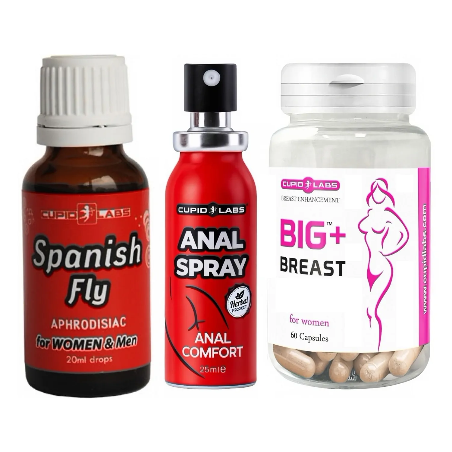 Cum să le folosiți împreună: începeți administrarea pastilelor conform indicațiilor pentru rezultate treptate (2 capsule/zi pentru Big Breast). Picăturile Spanish Fly se folosesc ocazional, 10–15 picături în lichid sau sub limbă cu ~30 minute înaintea momentului intim (maxim o doză în 24h). Spray-ul anal se aplică local cu câteva pulverizări înainte de penetrare, așteptați câteva minute pentru relaxare.
