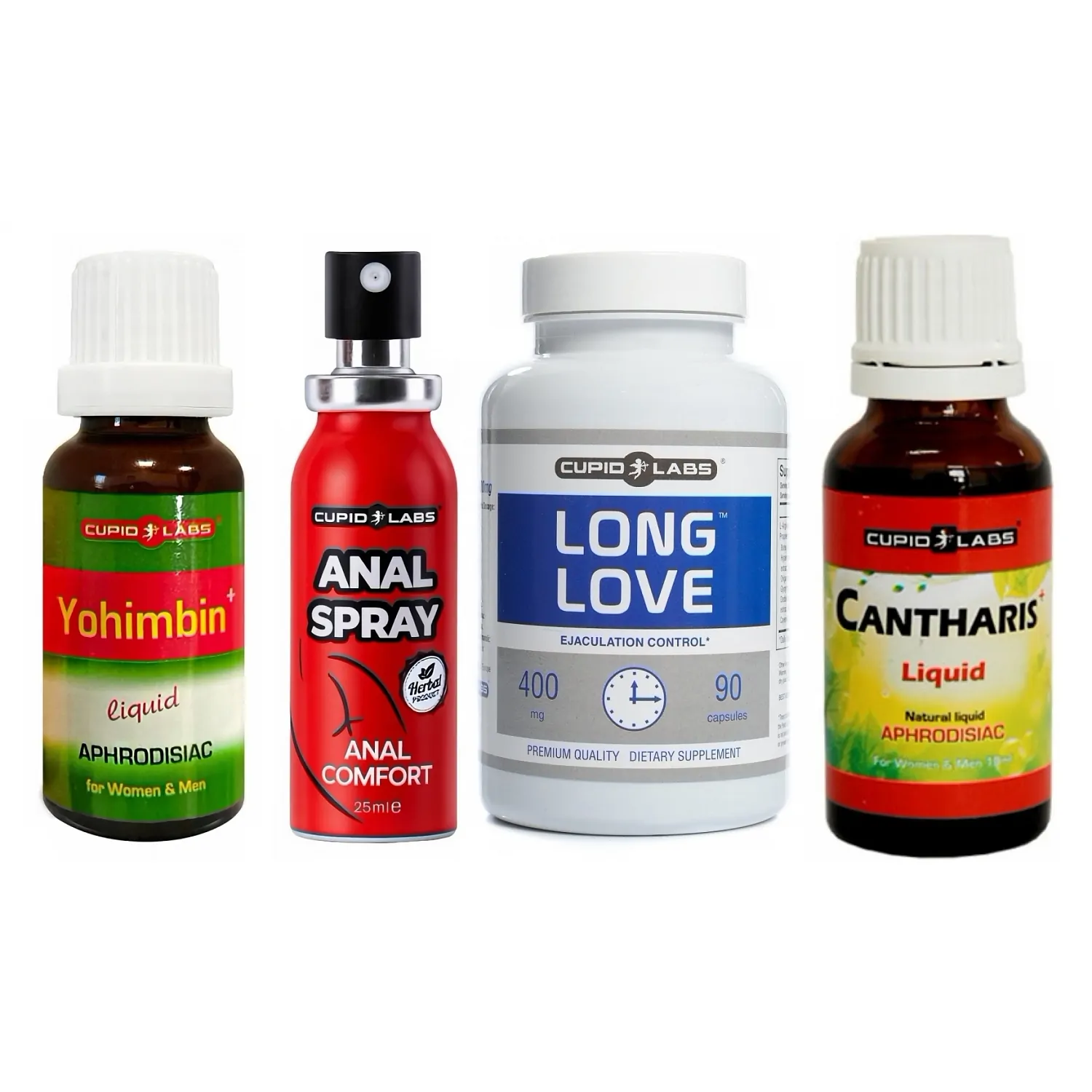 Set dedicat momentelor sexuale care prelungește performanța, crește dorința și ponderează disconfortul în momentul penetrațiilor anale. Pastilele pentru întârziere, picăturile afrodiziace și spray-ul se folosesc complementat: administrare preventivă, stârnire rapidă și aplicare locală.