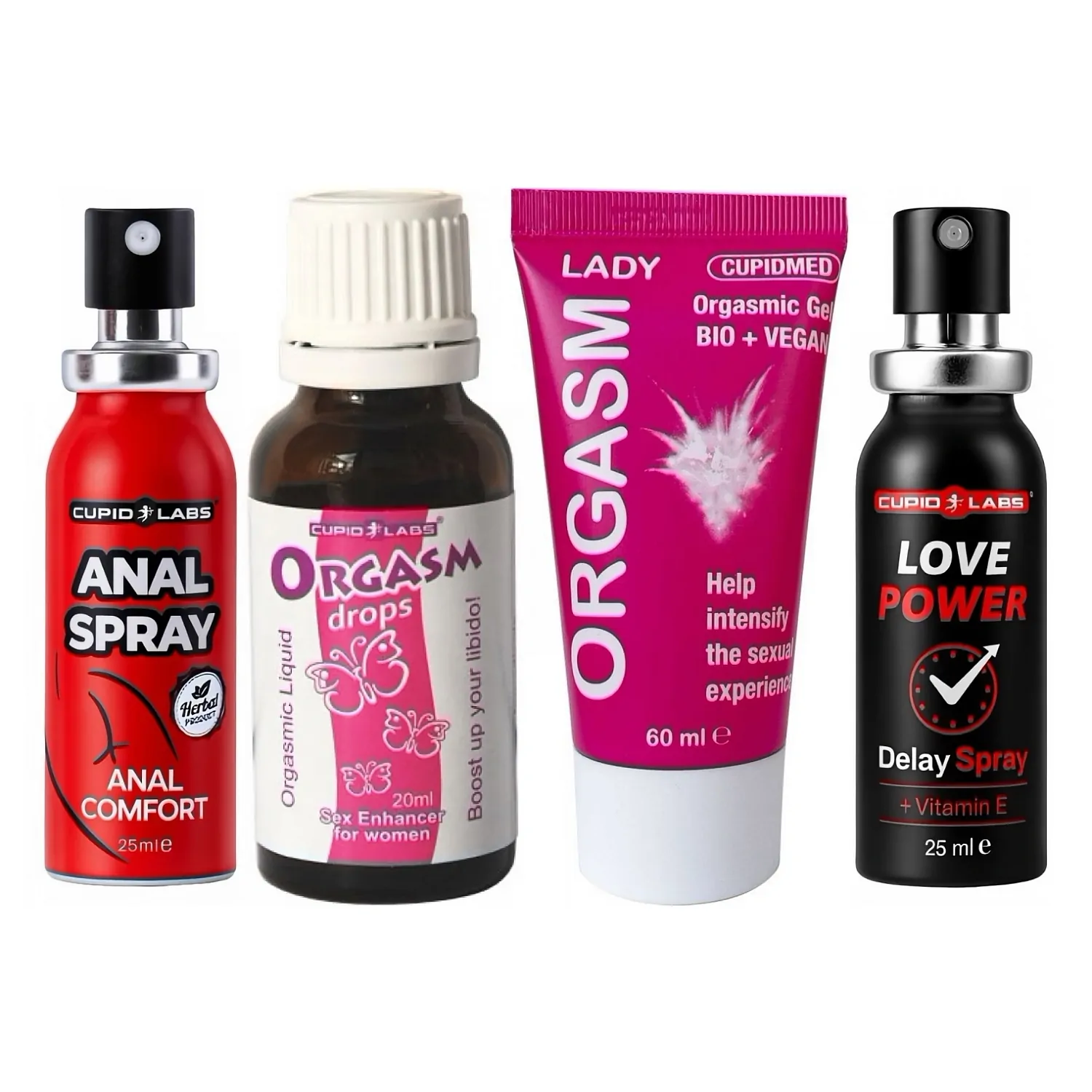 Acest pachet reunește patru soluții sinergice: un spray pentru întârzierea ejaculării (Love Power Delay 25 ml) care prelungește timpul culminant, un atomizator desensibilizator anal (Cupid Labs 25 ml) pentru o penetrare mai confortabilă, un gel pentru sporirea libidoului feminin (Orgasm Lady 60 ml) ce asigură senzații de încălzire și furnicături agreabile și picături afrodisiace (Exuberant Drops 20 ml) care cresc apetitul sexual. Asocierea vizează atât intarirea plăcerii, cât și controlul și relaxarea necesare pentru explorări sigure.Cum să folosiți corelat, pas cu pas: